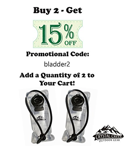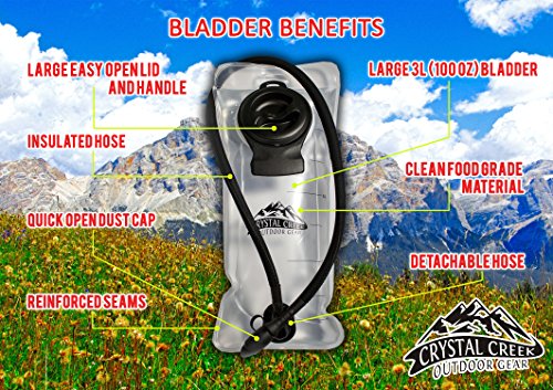 -. Brand : Crystal Creek Outdoor Gear -. Color : Clear -. EAN : 0641022822296 -. Feature : TASTE FREE CLEAN WATER from an FDA approved BPA FREE bladder with no plastic taste or smell. Easy to drink valve has dust cap to keep it clean. / EASY TO CLEAN AND FILL: Large opening and detachable tube allow more access to interior bladder. Cleaning, rinsing and drying is a breeze. / MADE STRONGER TO LAST LONGER with extra durable bladder and no-leak guarantee. Double reinforced seams prevent leakage. Perfect replacement for your premium hydration bladders. / COOL WATER IN ALL CLIMATES with an insulated hose and large lid whih allows for easy ice cube access and assures your ice lasts longer. Cool water keeps flowing even in extreme cold or heat. / 100% MONEY BACK GUARANTEE allows returns for any reason if you are not satisfied. -. IsAutographed : 0 -. IsMemorabilia : 0 -. Label : Crystal Creek -. Manufacturer : Crystal Creek -. PackageQuantity : 1 -. ProductGroup : Sports -. ProductTypeName : OUTDOOR_RECREATION_PRODUCT -. Publisher : Crystal Creek -. Studio : Crystal Creek -. Title : 3L Hydration Bladder - Easy Cleaning BPA Free Taste free FDA Approved, Quick release insulated tube and extra reinforced 100 oz Water Reservoir - Great for hiking, biking, running and more! -. UPC : 641022822296