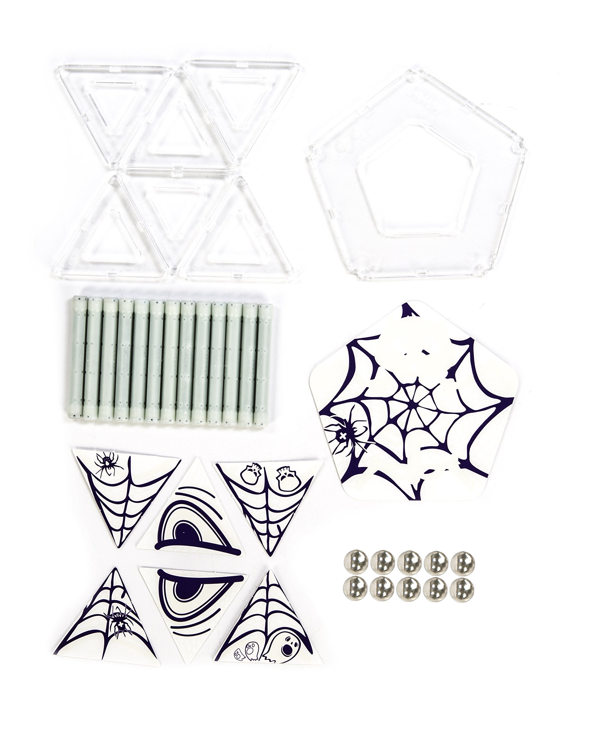 A set of 13 bars (glow), 10 balls, 7 panels (triangle, Pentagon / clear), 7 cardboards (with glow print).