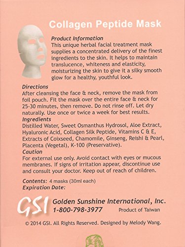 -. Binding : Misc. -. Brand : Golden Sunshine -. EAN : 8910140006010 -. Feature : New formula from Golden Sunshine! / Unique herbal facial treatment mask / Maintain translucence, whiteness and elasticity / Moisturizing the skin to give it a silky smooth glow for a healthy, youthful look / Contains 4 masks (30 ml each) -. Label : Golden Sunshine -. Manufacturer : Golden Sunshine -. PackageQuantity : 4 -. ProductGroup : Beauty -. ProductTypeName : BEAUTY -. Publisher : Golden Sunshine -. Studio : Golden Sunshine -. Title : Golden Sunshine - New Collagen Peptide Facial Mask (4 Masks, 30 ml each)