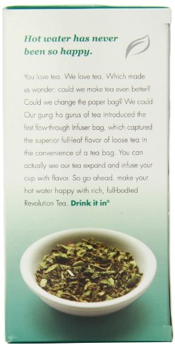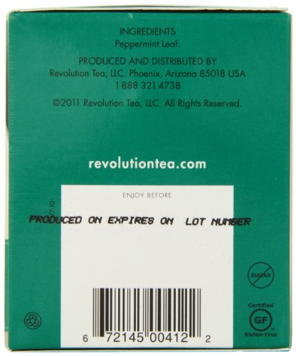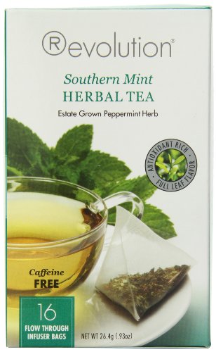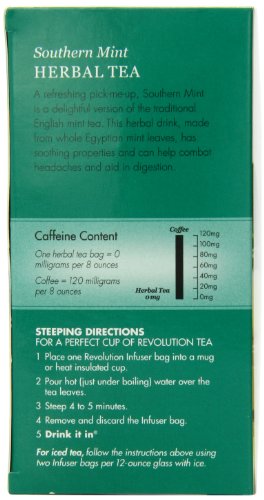 -. Binding : Grocery -. Brand : Revolution Tea -. Feature : A refreshing pick-me-up / Southern mint is a delightful version of the traditional English mint tea / This herbal drink, made from whole Egyptian mint leaves, has soothing properties and can help combat headaches and aid in digestion / Caffeine free -. IsAdultProduct : 0 -. Label : Revolution Tea -. Manufacturer : Revolution Tea -. NumberOfItems : 6 -. PackageQuantity : 6 -. ProductGroup : Grocery -. ProductTypeName : GROCERY -. PublicationDate : 2013-11-01 -. Publisher : Revolution Tea -. ReleaseDate : 2015-07-16 -. Studio : Revolution Tea -. Title : Revolution Tea Herbal Tea, Southern Mint, 16 Count (Pack of 6)