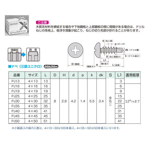 ●薄鋼板+鉄骨用ドリルビス 便利な小袋入り