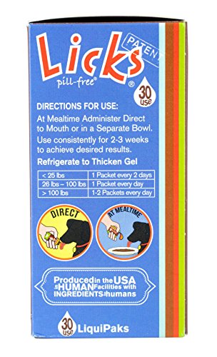 LICKS Skin + Allergy helps to alleviate hot spots, itchy skin and other skin-born allergies so common in canines. Healthy skin and coat means a reduction of dander, decreased shedding, less irritability and more protective fur. LICKS Skin and Allergy + Shiny Coat formula ensures your dog is receiving all the nutrients they need to maintain their good coat. • High levels of Omega 3s and anti-inflammation agents help to heal and moisturize the coat form the inside out. And as an added bonus LICKS only uses Omega 3s that has been derived from small fish, ensuring higher quality and safer standards. • The Curcumin and Inositol used in Skin and Allergy + Shiny Coat work together to reduce inflammation, ease joint pain and treat chronic skin disorders. If your pup gets skin irritations in the cold winter months or spring/summer allergy season and you don't know how to ease the licking and scratching, LICKS Skin + Coat is the solution for you! Try Skin and Allergy + Shiny Coat and stay at ease knowing you're only giving your pup all natural, human grade ingredients. About LICKS Pill-Free LICKS Pill-Free is an innovative new delivery system for high quality supplements. Unlike pills or chews, LICKS comes in individually dosed, great tasting gel packets which allow for a 98% absorption rate. Each LICKS formula is made in the USA in human facilities with all natural, human grade ingredients that have been sourced in the Americas. For easy administration, LICKS can be added to food, direct to mouth, or in a separate bowl. With medicinal levels of each active ingredient and a 98% absorption rate, LICKS is a next generation solution to pet ailments.Feature