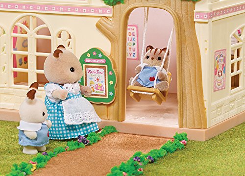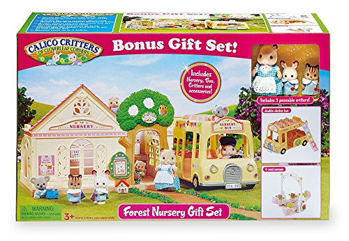 This set contains over 30 pieces including nursery with swing, double-decker bus with slide, 3 critters, seesaw, piano, bench, school seats, table, books, blocks, toys & more. Bus seats 14 critters and seesaw seats 4 critters. Nursery measures 10 1/4" x 6 1/4" x 7 1/2". Bus measures 8 1/2" x 5 x 4 1/2".