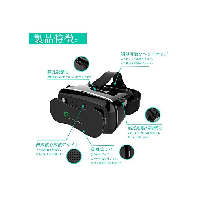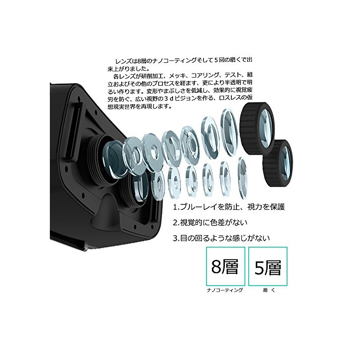 근시800도 원시400도에 대응:PMMA광학비 구면 렌즈를 채용하고, 시야각103도로 현장감이 넘칩니다.(시야각이 95도 미만이면,시야가 좁은 것이 지나치다.시야각이 108도 보다 큰 경우는,현기증감이 강하고, 102도부터 108도까지의는 최선의 시야각이다)3.5 ~6인치의 스크린을 구비했(갖췄)다(iOS/Android )스마트 폰에 적합하게 있습니다.