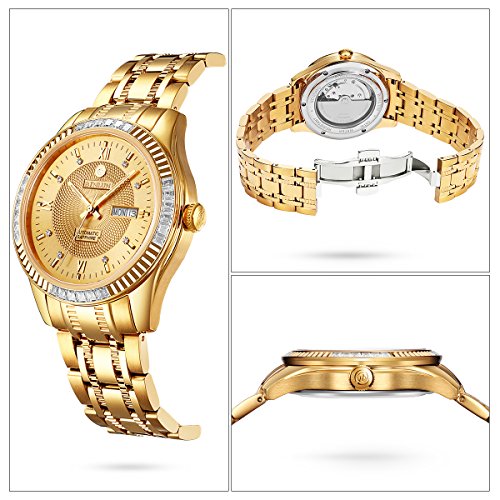 BINLUN 손목시계 기계식 다이아몬드 고급감 시 스루(see through) 백 자동 감기 골드 문자판 금 워치 [병행수입품]