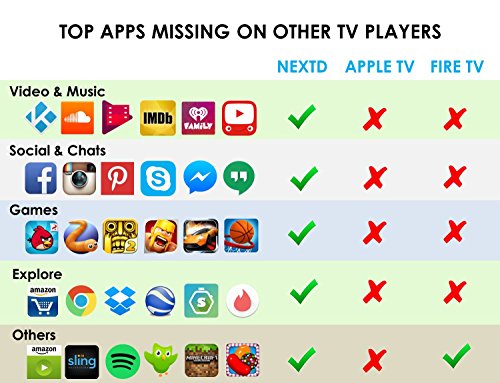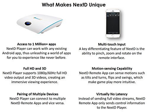 -. Feature : HIGHEST PERFORMANCE & FULLY OPTIMIZED FOR KODI: True 8-Core 2GHz CPU runs 2x faster than quad-core CPUs in other TV boxes. 100Mbps 2.4GHz WiFi+Ethernet provides up to 20x the bandwidth needed for HD video streaming. Hardware acceleration and smart color technology deliver smooth KODI video streams and vivid colors in full HD and 3D. Easily install the latest KDOI app from Google Play Store and customize with a free KODI setup wizard. Free VPN Available. / 1 MILLION+ APPS & GAMES, LEAST RESTRICTIONS: Amazon Video, Netflix, Hulu, Sling, YouTube, PLEX, HBO, ESPN, , Spotify, plus 20,000+ other media & entertainment apps. Minecraft, Slither.io, Temple Run, Clash of Clans, Real Racing, plus 300,000+ other touch & motion based Android games that are only playable on TV using NextD. Easily install 1 million+ apps from Google Play & Amazon App Store. Surf the Internet via Chrome, FireFox, or other browsers and access content not in the app stores. / UNIQUE MULTI-TOUCH & MOTION REMOTE CONTROL: NextD is the only smart TV platform that enables full remote control of Android apps on TV via a smartphone. The free NextD Remote app (iOS/Android) transmits a user's touch, motion, and keyboard inputs from a smartphone to TV, unlocking 1M+ touch & motion based Android apps for TV for the first time. As a result, NextD has 100x more apps & games than Apple TV, Android TV, Roku, Chromecast, or any other smart TV platforms and Android gaming consoles. / EASY SETUP & FULL SUPPORT: A friendly setup wizard guides the users through the simple initial setup process using only the included IR remote. Easily look up FAQs or chat with the support team from within the NextD Remote app or from our support portal (support.nextdtv.com). We guarantee a response within 24 hours. All NextD orders are protected by 30 day free returns and 1 year manufacturer's warranty. / UPDATES, EXTENSIONS, & ENDLESS POSSIBILITIES: NextD's firmware is frequently updated over-the-air to apply the latest features and improvements (VPN patch via OTA update since 8/4/2016). Two USB ports on NextD Player enable optional accessories such as webcam (for Skype, Google Hangout, etc.), external hard drives, game pads, mouse, and keyboards. Be sure to check out the official NextD TV product demo & tutorial videos before purchase and discover what is possible with NextD.