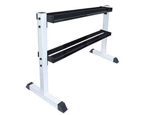 The space saving DBR-2 dumbbell rack is made from heavy guage steel. It can hold up to 275lbs of weights, and is powder coated to resist chips and dings. Both shelves are rubber coated to help prevent dumbbell rolling and chips. It can accommodate 5-50lb (not 8lb or 12lb) of cast iron, rubber hex or chrome dumbbells. Assembly is required.