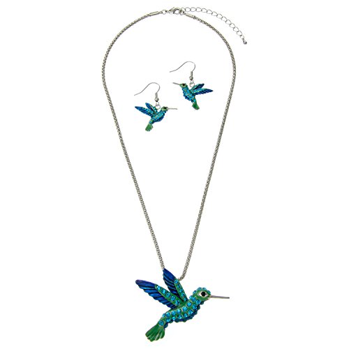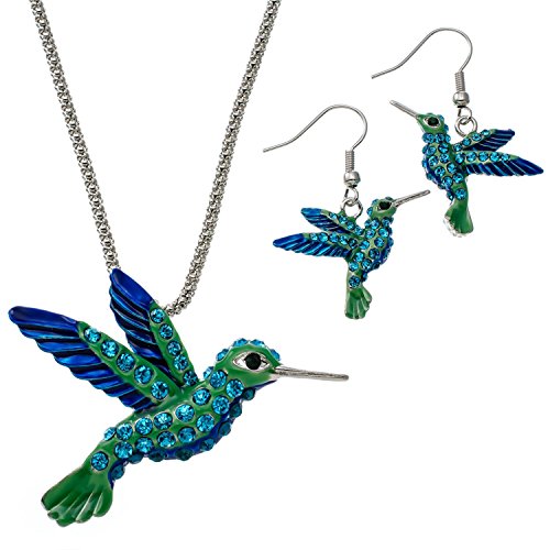 Here is a very pretty and sparkling blue and green hummingbird necklace and earring set. Necklace is on a thick silvertone chain measuring 18" and the hummingbird charm measures 1 3/4" long and 2 1/8" wide. Earrings are on silvertone fishhook wires and measure 1 1/4" long. Comes in gift box.Feature