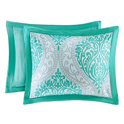 PRODUCT FEATURES - Teal and Grey comforter set, features printed damask pattern. Vacuum sealed for transit protection, space saving and gifting ready