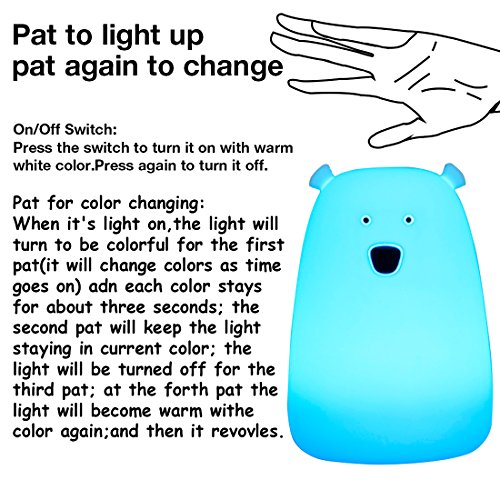 - CUTE BEAR FACE:Super cartoon light with lovely bear face gives a pleasantly soft touch because made by BPA-free washable silicone.It makes a perfect night decor for the bedroom bedside of study,baby room as well as a fabulous gift idea especially for kids. And the design of handhold size and eco-friendly for every people.