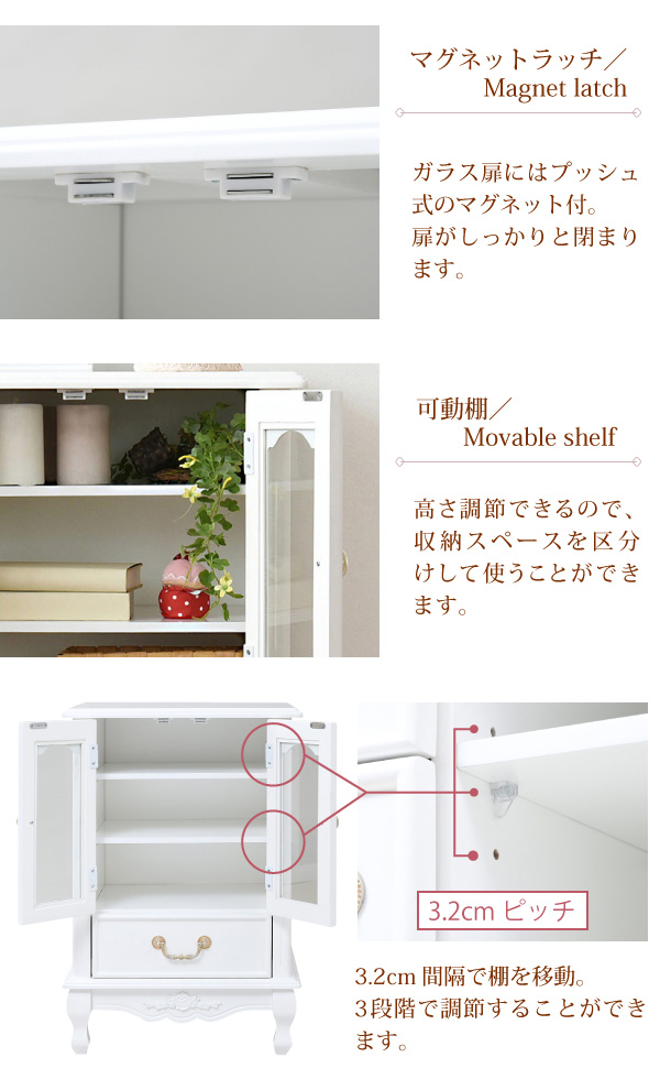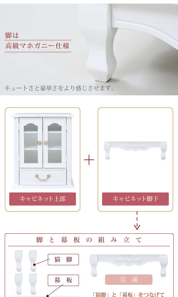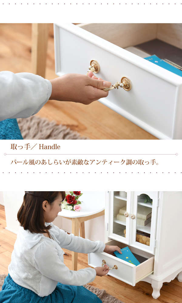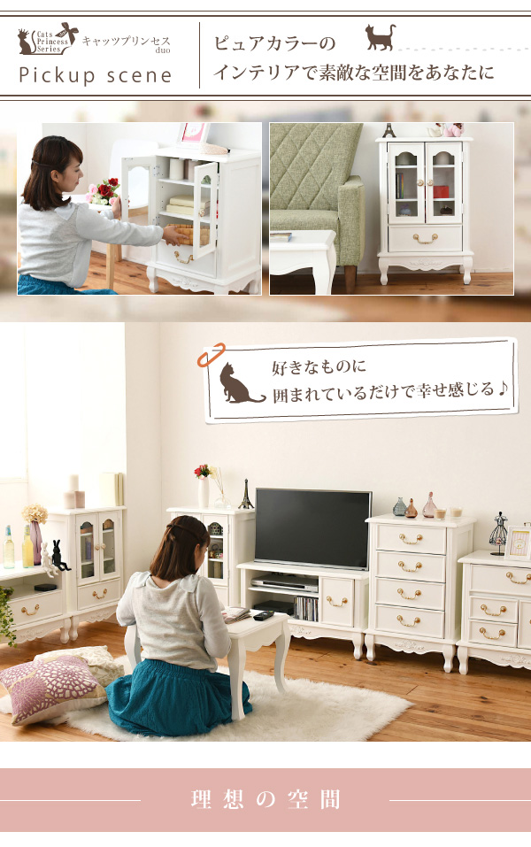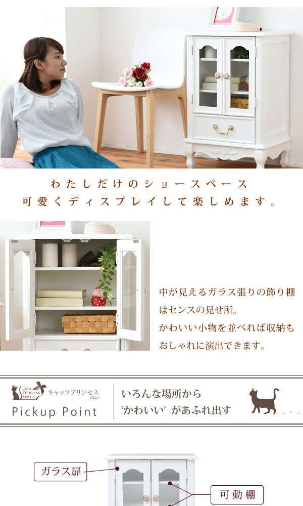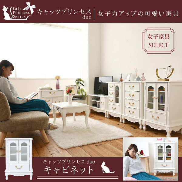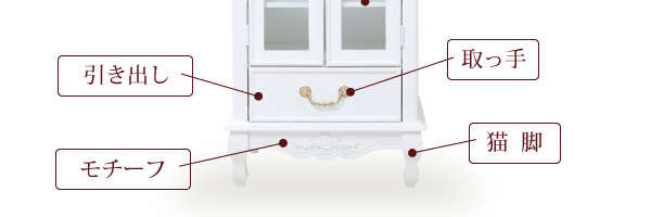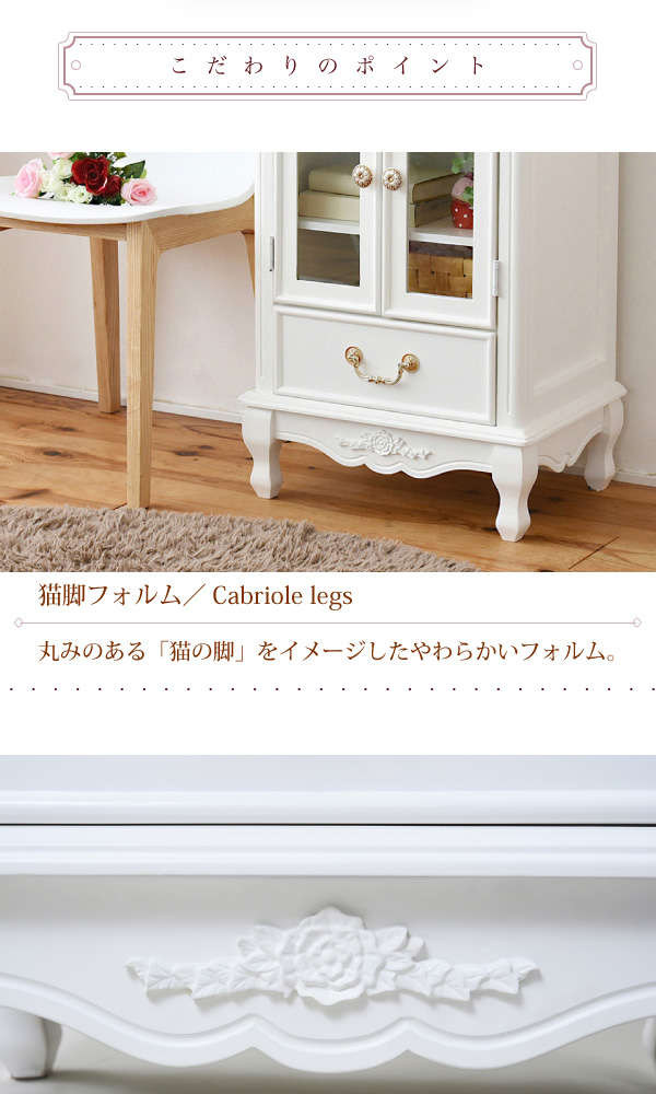 ●薔薇のレリーフ、かわいい猫脚、アンティーク調の取っ手がお姫様な気分を演出するキャッツプリンセスシリーズのキャビネット