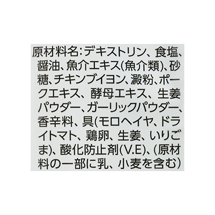 원재료:덱스트린,식염,간장,생선 및 조개류 엑기스(어패류)고, 설탕,치킨 bouillon,전분,포크 엑기스,효모 엑기스,생강 파우더,마늘 파우더,향신료,구(《모로헤이야》,드라이 토마토,계란,생강,있어 참깨)고, 산화 방지제(V.E)고,(원재료의 일부에 젖,밀을 포함한다)