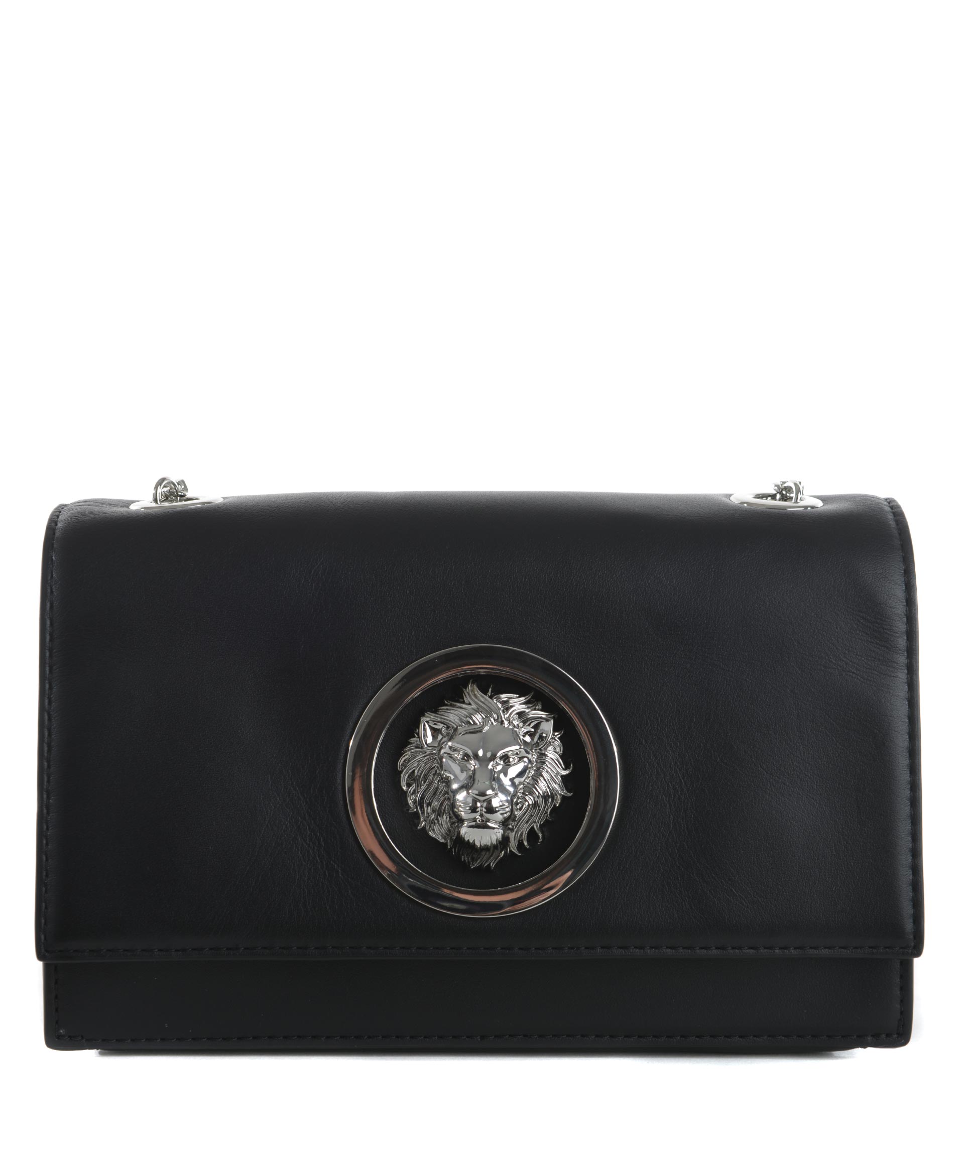Borsetta Versus in nappa Nero. Manico lungo a catena argento. Patta frontale con oblò e logo "testa di leone" in metallo argentato. Chiusura a calamita. Tasca interna. Foderata. Misure: altezza 13 cm, larghezza 21 cm, profondità 7 cm 100% pelle