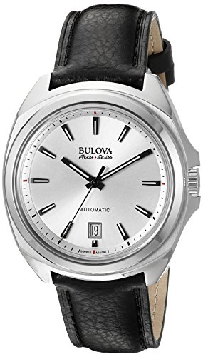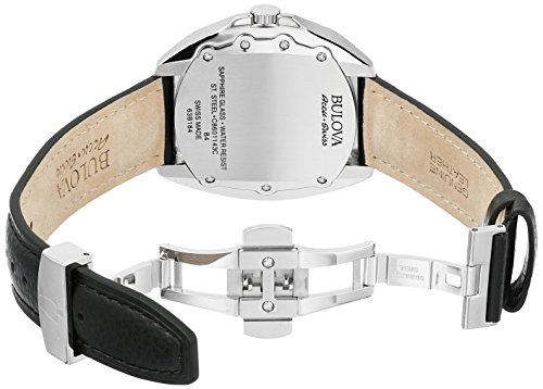 -. Feature : Automatic Swiss made movement; date window at 6:00 / Silver dial with gunmetal and white hands and hour markers; luminous; sapphire crystal; stainless steel case; black leather strap / Swiss-automatic Movement / Case Diameter: 42mm / Water Resistant To 30m (100ft): In General, Withstands Splashes or Brief Immersion In Water, but not Suitable for Swimming or Bathing / Bulova Accu Swiss 63B184 Automatic Watch / This intriguing Swiss made automatic timepiece, in stainless steel with double-curved, anti-reflective sapphire box crystal, and Date window at 6 o'clock / Mechanical-hand-wind Movement / Water Resistant To 99 Feet