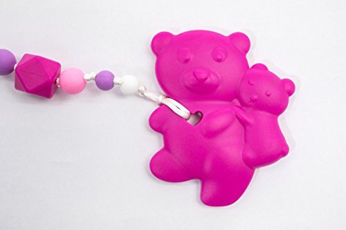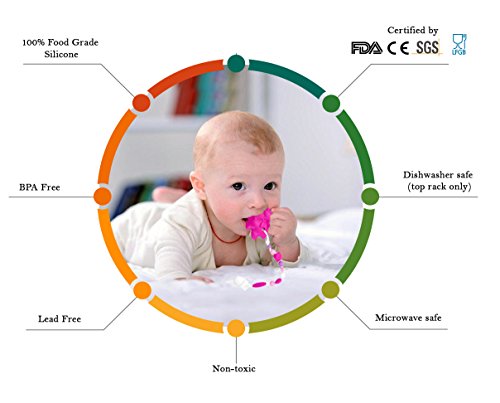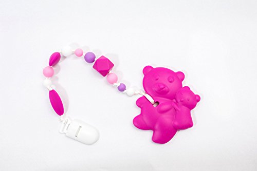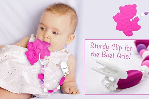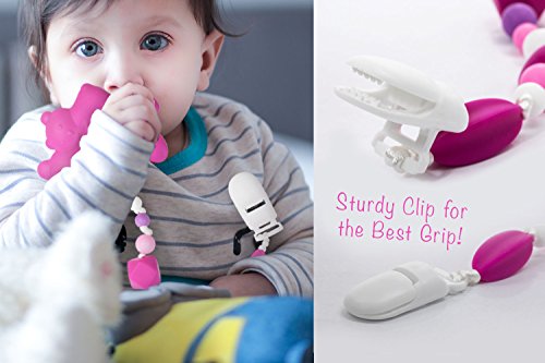 Our Tundras 100% food grade silicone teether and clip is a safe way for babies to relieve the pain of teething. Our soft silicone is certified BPA free, Lead free, Non-toxic and approved for use by the FDA, SGS, LFGB, and CE. Our teether fits in a baby's hand, has an attached silicone beaded clip that is both safe and colorful as well as soft in a baby's mouth. Clip the teether to your baby's clothing for ease of use. The teether can be cooled in the freezer or warmed in the microwave and is dishwasher safe, top rack only. Safe for temperatures from -76°F to 392°F.Feature
