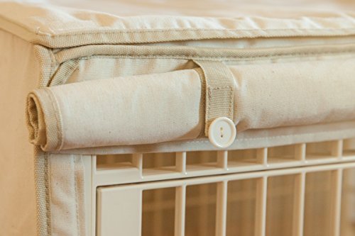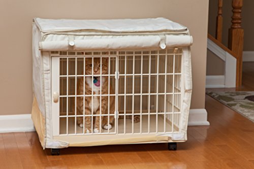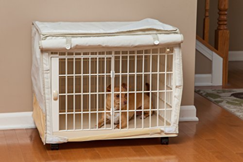 Product Description Your dog will stay calm and relaxed in this covered crate. This lightweight cover provides security for your fury friend when needed. The crate has four wheels to easily move from room to room. 0