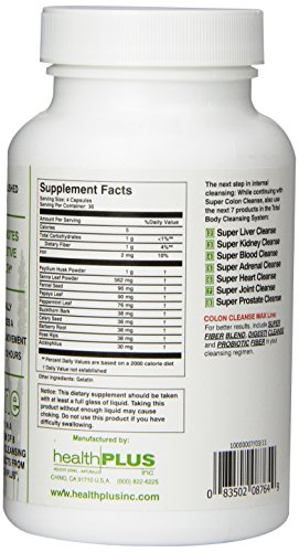 ReleaseDate : 2015-03-19 Studio : Health Plus Publisher : Health Plus Binding : Health and Beauty Product Description Super colon cleanse is a great starting point for individuals who are beginning a cleansing program or for individuals who need a thorough cleanse. It is all natural, non-invasive, and provides results you can feel and see. The colon is one of the primary organs involved in the body's internal detoxification and elimination process. A clean colon with a healthy balance of intestinal flora is the body's first line of defense. Suggested use for adults: 2 teaspoons (10g) preferably 1 teaspoon (5g) twice daily. Mix well with at least 10-12 ounces of water, juice or your favorite beverage and drink immediately. For children 6-12 years, use 1/3 the adult dosage. 0