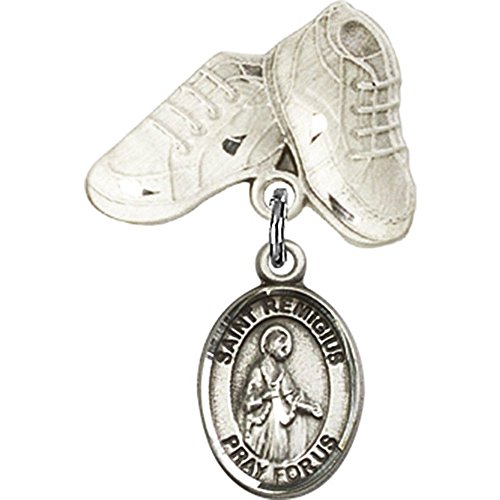 -. Title : Sterling Silver Baby Badge with St. Remigius of Reims Charm and Baby Boots Pin 1 X 5/8 inches
