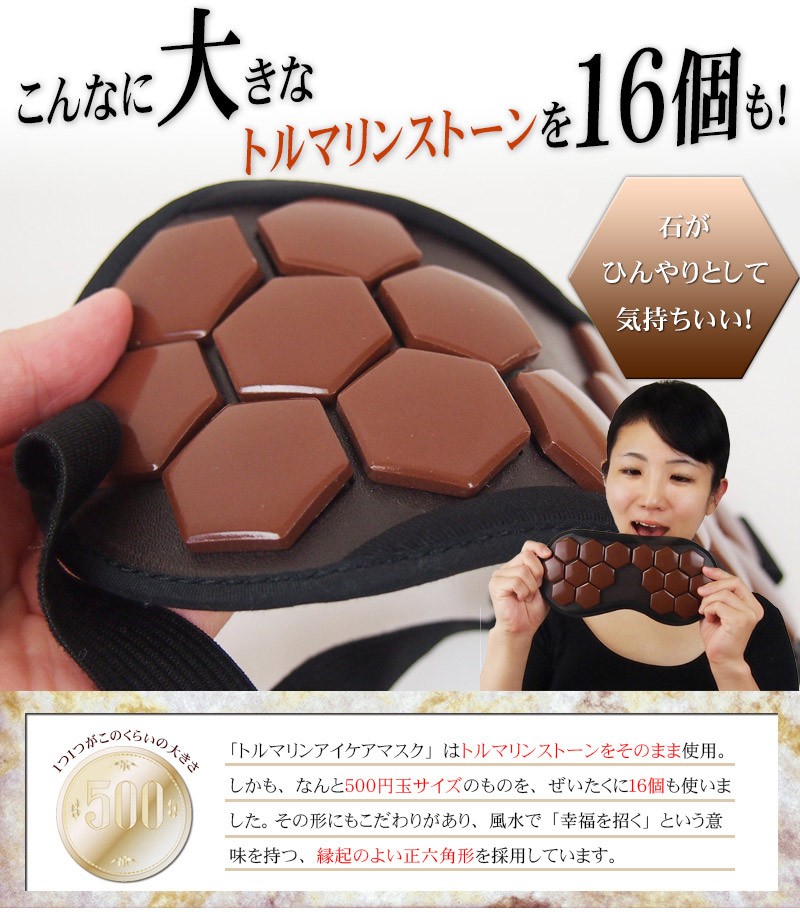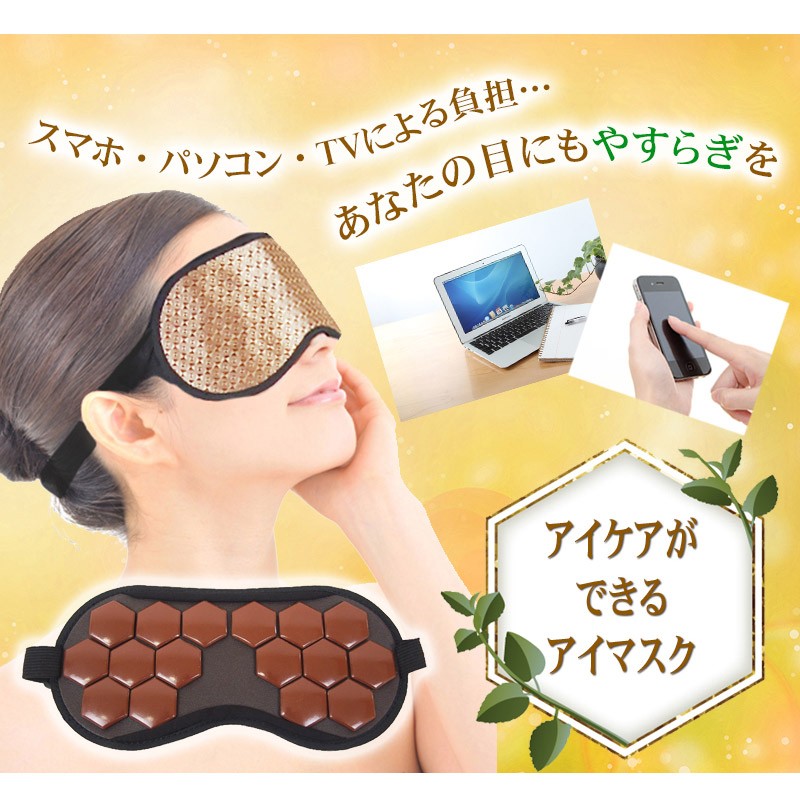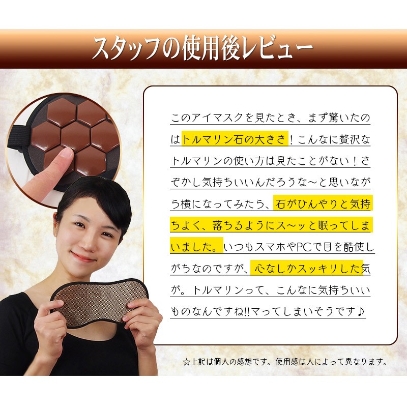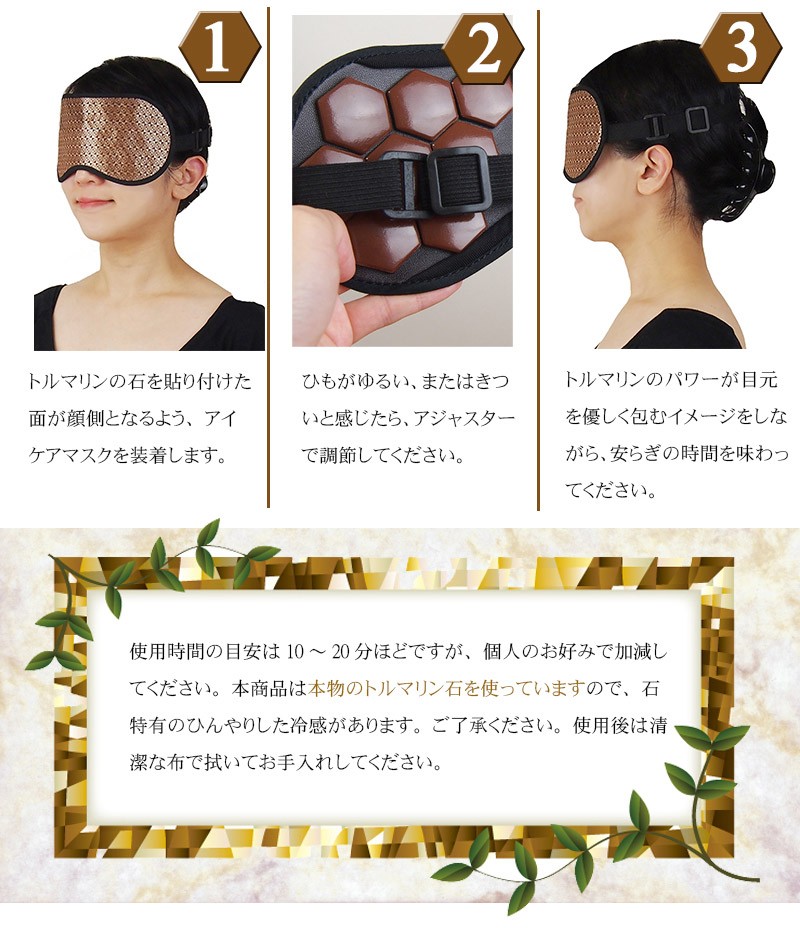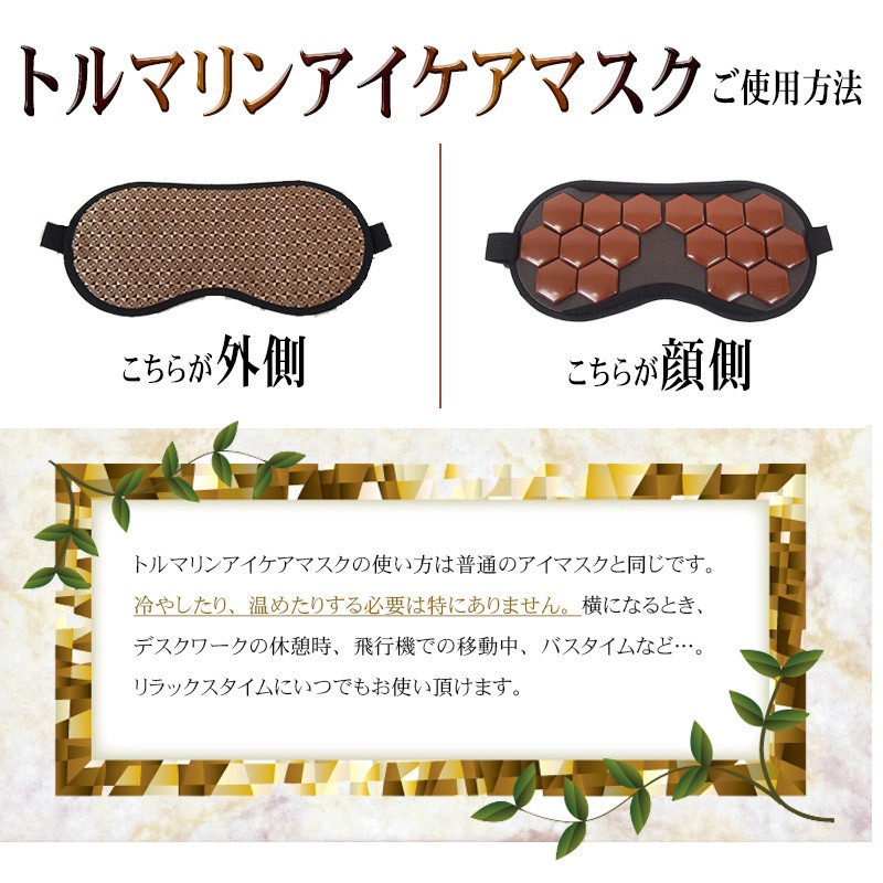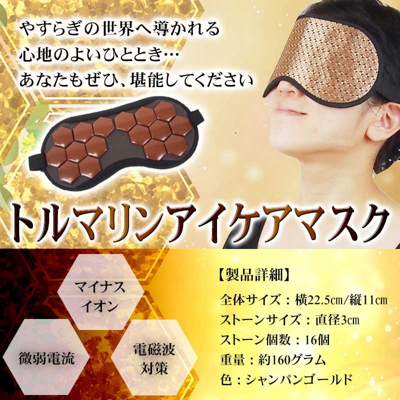 【製品名:トルマリンアイケアマスク】 16個のトルマリンストーンが目を優しく包む!ほっとできるひとときをあなたに。 スマホ・パソコン・TVによる負担…あなたの目にもやすらぎを。アイケアができるアイマスク ━━━━━━━━━━━ トルマリンアイケアマスク の特徴とは? ━━━━━━━━━━━ ・「トルマリンアイケアマスク」はトルマリンストーンをそのまま使用。しかも、なんと500円玉サイズのものを、ぜいたくに16個も使いました。 その形にもこだわりがあり、風水で「幸福を招く」という意味を持つ、縁起のよい正六角形を採用しています。 ・飛行機の中や新幹線での移動中など、外出中でも使う機会のある アイマスクだから、高級感のあるシャンパンゴールドの生地を採用。 もちろん遮光性も抜群。周りの環境を気にすることなく、安心して やすらぎの時間を過ごせます。 ・トルマリンアイケアマスクは専用のアジャスター付きで、頭のサイズに合わせて調整が可能です。また、長時間の使用でも負担にならないよう、頭に優しいゴム紐を使用。 男女関係なく家族みんなでご利用頂けます。 ━━━━━━━━━━━ トルマリンのパワーとは? ━━━━━━━━━━━ 【1】マイナスイオンが半永久的に発生 マイナスイオンは滝や噴水など、水しぶきの多い場所に多く存在します。しかし通常の生活空間では微量にしか存在しません。トルマリンは半永久的にマイナスイオンを発生する性質を持っているため、わざわざ水しぶきの近くに行かなくても、気軽にマイナスイオンを日常の中に取り入れることが出来ます。 【2】生体に近い微弱電流が流れる 人体には「生体電流」という微弱な電流が流れており、健康の維持のためにはこの生体電流が正常に流れていることが重要です。しかし、加齢や生活習慣によって生体電流に乱れが生じると、さまざまな変化が現れます。トルマリンは生体電流に近い微弱な電流が流れているため、健康を維持したいと考えているユーザー様に注目されています。 【3】手軽な電磁波対策として人気 現代人の生活には電磁波が溢れています。電磁波と健康の関係については未だに明らかになっていない部分もあるため、身体への影響を気にするあまり、精神的な健康を損なう人も少なくありません。電磁波のあふれている環境でも安心して生活するために、トルマリングッズを身に付けている方も多く存在します。 ━━━━━━━━━━━ 例えばこんなときに! ━━━━━━━━━━━ デスクワークの 休憩時に スマホ操作後の アイケアに 飛行機・新幹線 など移動中に リフレッシュしたいときに バスタイム中に お休み中に ━━━━━━━━━━━ 当てはまったあなたに! ━━━━━━━━━━━ ・デスクワークが多い ・PCの作業時間が長い ・スマホを操作する頻度が高い ・スッキリとした朝を迎えたい ・手軽にアイケアがしたい ・やすらげる時間が欲しい ・マイナスイオンを取り入れたい ・電磁波の影響が気になる ・今のアイマスクでは物足りない ・トルマリンのパワーを試したい ━━━━━━━━━━━ ご使用方法 ━━━━━━━━━━━ トルマリンアイケアマスクの使い方は普通のアイマスクと同じです。石のついたほうが顔側になるように装着してください。冷やしたり、温めたりする必要は特にありません。横になるとき、デスクワークの休憩時、飛行機での移動中、バスタイムなど…。 リラックスタイムにいつでもお使い頂けます。使用時間の目安は10~20分ほどですが、個人のお好みで加減してください。本商品は本物のトルマリン石を使っていますので、石特有のひんやりした冷感があります。ご了承ください。使用後は清潔な布で拭いてお手入れしてください。 ━━━━━━━━━━━ スタッフも使ってみました ━━━━━━━━━━━ このアイマスクを見たとき、まず驚いたのはトルマリン石の大きさ!こんなに贅沢なトルマリンの使い方は見たことがない!さぞかし気持ちいいんだろうな~と思いながら横になってみたら、石がひんやりと気持ちよく、落ちるようにス~ッと眠ってしまいました。いつもスマホやpcで目を酷使しがちなのですが、心なしかスッキリした気が。トルマリンって、こんなに気持ちいいものなんですね!!マってしまいそうです♪ ━━━━━━━━━━━ 製品詳細 ━━━━━━━━━━━ 全体サイズ:横23㎝/縦11.5㎝ ストーンサイズ:直径3㎝ ストーン個数:16個 重量:約160グラム 色:シャンパンゴールド 生産国:中国 |