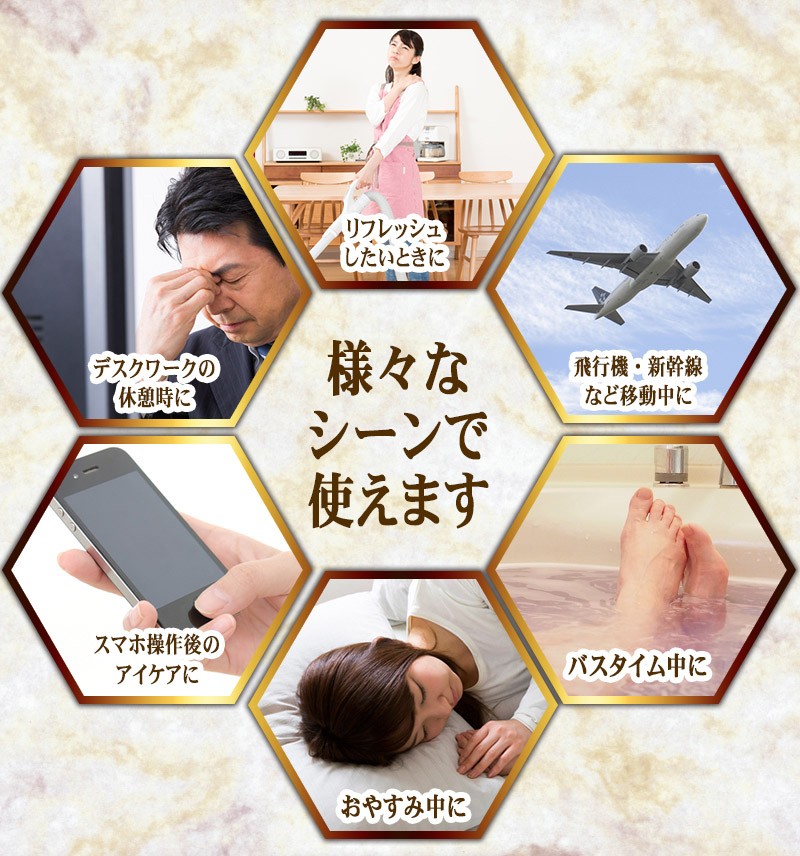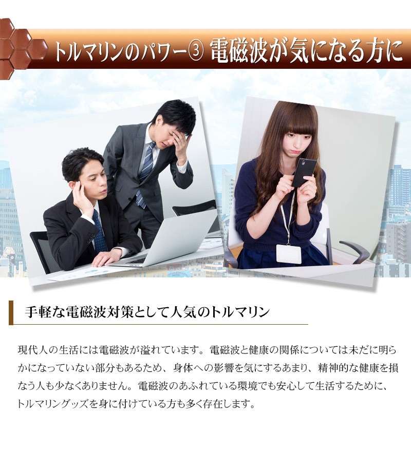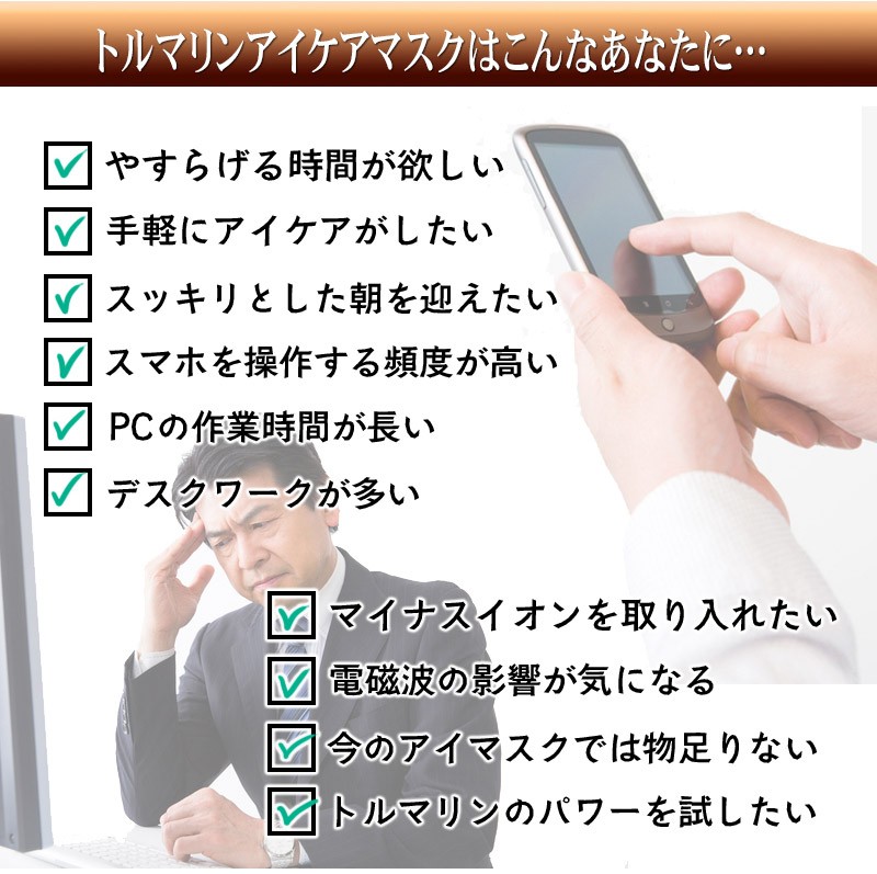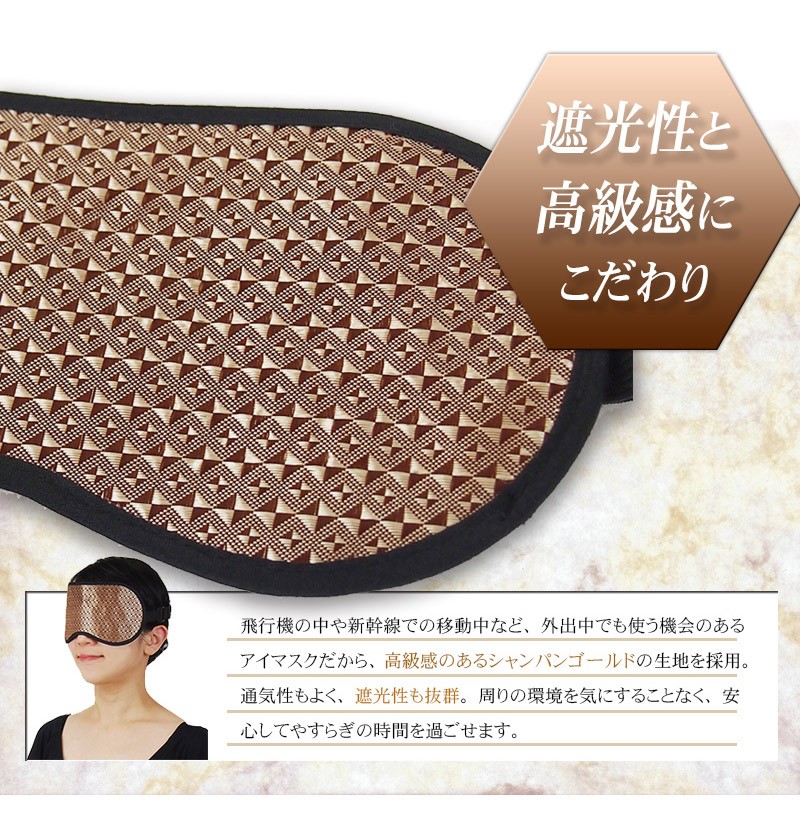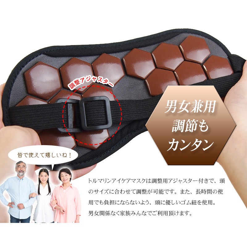 【製品名:トルマリンアイケアマスク】 16個のトルマリンストーンが目を優しく包む!ほっとできるひとときをあなたに。 スマホ・パソコン・TVによる負担…あなたの目にもやすらぎを。アイケアができるアイマスク ━━━━━━━━━━━ トルマリンアイケアマスク の特徴とは? ━━━━━━━━━━━ ・「トルマリンアイケアマスク」はトルマリンストーンをそのまま使用。しかも、なんと500円玉サイズのものを、ぜいたくに16個も使いました。 その形にもこだわりがあり、風水で「幸福を招く」という意味を持つ、縁起のよい正六角形を採用しています。 ・飛行機の中や新幹線での移動中など、外出中でも使う機会のある アイマスクだから、高級感のあるシャンパンゴールドの生地を採用。 もちろん遮光性も抜群。周りの環境を気にすることなく、安心して やすらぎの時間を過ごせます。 ・トルマリンアイケアマスクは専用のアジャスター付きで、頭のサイズに合わせて調整が可能です。また、長時間の使用でも負担にならないよう、頭に優しいゴム紐を使用。 男女関係なく家族みんなでご利用頂けます。 ━━━━━━━━━━━ トルマリンのパワーとは? ━━━━━━━━━━━ 【1】マイナスイオンが半永久的に発生 マイナスイオンは滝や噴水など、水しぶきの多い場所に多く存在します。しかし通常の生活空間では微量にしか存在しません。トルマリンは半永久的にマイナスイオンを発生する性質を持っているため、わざわざ水しぶきの近くに行かなくても、気軽にマイナスイオンを日常の中に取り入れることが出来ます。 【2】生体に近い微弱電流が流れる 人体には「生体電流」という微弱な電流が流れており、健康の維持のためにはこの生体電流が正常に流れていることが重要です。しかし、加齢や生活習慣によって生体電流に乱れが生じると、さまざまな変化が現れます。トルマリンは生体電流に近い微弱な電流が流れているため、健康を維持したいと考えているユーザー様に注目されています。 【3】手軽な電磁波対策として人気 現代人の生活には電磁波が溢れています。電磁波と健康の関係については未だに明らかになっていない部分もあるため、身体への影響を気にするあまり、精神的な健康を損なう人も少なくありません。電磁波のあふれている環境でも安心して生活するために、トルマリングッズを身に付けている方も多く存在します。 ━━━━━━━━━━━ 例えばこんなときに! ━━━━━━━━━━━ デスクワークの 休憩時に スマホ操作後の アイケアに 飛行機・新幹線 など移動中に リフレッシュしたいときに バスタイム中に お休み中に ━━━━━━━━━━━ 当てはまったあなたに! ━━━━━━━━━━━ ・デスクワークが多い ・PCの作業時間が長い ・スマホを操作する頻度が高い ・スッキリとした朝を迎えたい ・手軽にアイケアがしたい ・やすらげる時間が欲しい ・マイナスイオンを取り入れたい ・電磁波の影響が気になる ・今のアイマスクでは物足りない ・トルマリンのパワーを試したい ━━━━━━━━━━━ ご使用方法 ━━━━━━━━━━━ トルマリンアイケアマスクの使い方は普通のアイマスクと同じです。石のついたほうが顔側になるように装着してください。冷やしたり、温めたりする必要は特にありません。横になるとき、デスクワークの休憩時、飛行機での移動中、バスタイムなど…。 リラックスタイムにいつでもお使い頂けます。使用時間の目安は10~20分ほどですが、個人のお好みで加減してください。本商品は本物のトルマリン石を使っていますので、石特有のひんやりした冷感があります。ご了承ください。使用後は清潔な布で拭いてお手入れしてください。 ━━━━━━━━━━━ スタッフも使ってみました ━━━━━━━━━━━ このアイマスクを見たとき、まず驚いたのはトルマリン石の大きさ!こんなに贅沢なトルマリンの使い方は見たことがない!さぞかし気持ちいいんだろうな~と思いながら横になってみたら、石がひんやりと気持ちよく、落ちるようにス~ッと眠ってしまいました。いつもスマホやpcで目を酷使しがちなのですが、心なしかスッキリした気が。トルマリンって、こんなに気持ちいいものなんですね!!マってしまいそうです♪ ━━━━━━━━━━━ 製品詳細 ━━━━━━━━━━━ 全体サイズ:横23㎝/縦11.5㎝ ストーンサイズ:直径3㎝ ストーン個数:16個 重量:約160グラム 色:シャンパンゴールド 生産国:中国 |