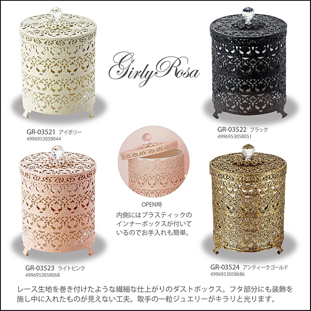 "Epower Girly Rosa Trash Box GR - 03524 Antique Gold" is a delicate finished garbage box like a wrapped lace fabric.