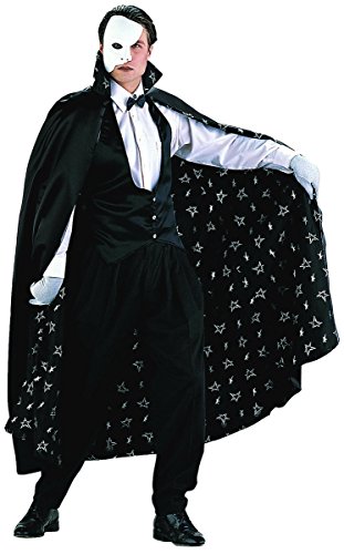 -. Feature : Mens Phantom Cape, Satin Vest, Bow Tie, "Opera" Mask. Black, White, Silver. (Inside Silver Print is Diff. than Pictured- Smaller Stars/Moons) (Shirt/Gloves/Pants Not Included) / Mens Sizes: XSM, (34-36) SM (36-38); MED (40-42); LG (42-44); XLG (46-48) / XLG Cape: 50" Length; 100% Polyester (Dry Clean Only) / Long Satin Cape w/ Loop and Button Neck Clasp, Lined w/ Black w/ Silver Moon/Star Pattern; Satin Vest Front w/ Halter Neck Band, Velcro Tab and Back Waist Ties, Mock Buttons in Front; Plastic Molded Half Opera Mask w/ Elastic Band