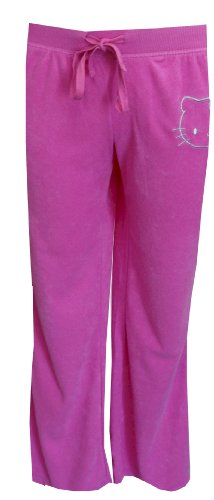 Looking for a basic sweat that is still super cute? Look no further! These loungepants for women feature a silver embroidered Hello Kitty head for a simple look that coordinates with so many HK tops! The lounge pants are 80% cotton, 20% polyester baby fine Terry and have a covered elastic waistband with adjustable drawstring tie, 29" inseam and slim fit. Junior Cut.Feature