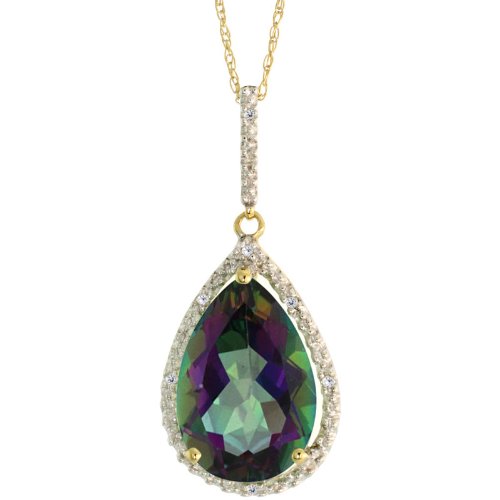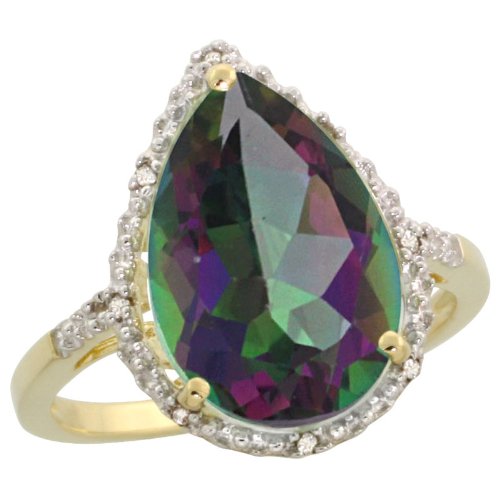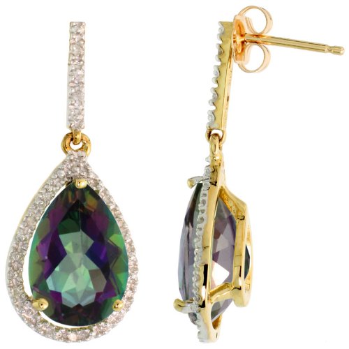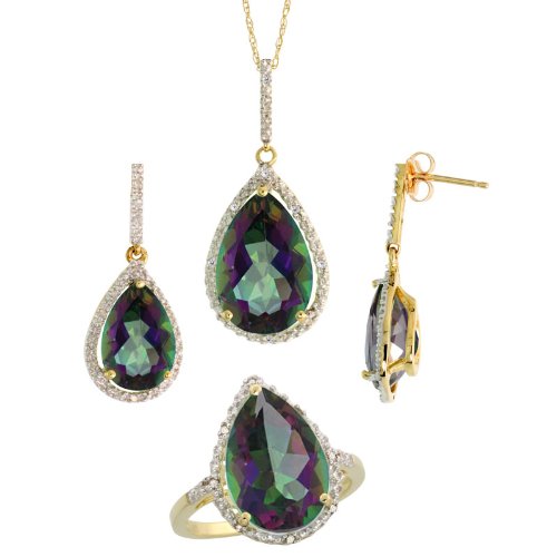 -. Title : 10k Gold Teardrop Dangle Earrings (26mm tall), Ring (17mm wide) & 18 in. Necklace SET, w/ Brilliant Cut Diamonds & Pear Cut Mystic Topaz Stones; Ring Size 5