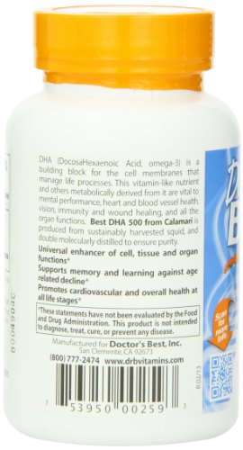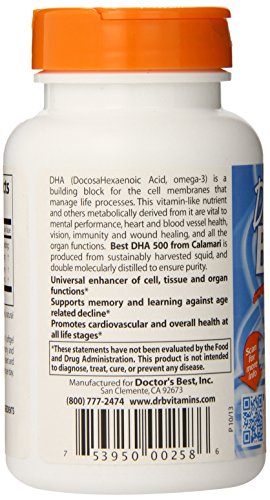 -. Binding : Health and Beauty -. Brand : Doctor's Best -. Label : Doctor's Best -. Manufacturer : Doctor's Best -. PackageQuantity : 1 -. ProductGroup : Health and Beauty -. ProductTypeName : HEALTH_PERSONAL_CARE -. Publisher : Doctor's Best -. Studio : Doctor's Best -. Title : Doctor's Best Best DHA 500 from Calamari, 500 mg Softgels