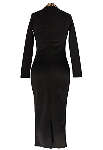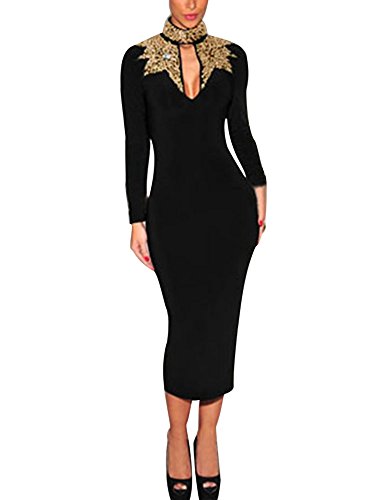 Black Gold Sequins Mock Neck Midi Dress designed to make your everyday style envied by other ladies. It¡¯s styled with a close-fitting silhouette, long sleeved, mock neck with silver sequins which makes the total more sparkling of all. Front slit at bust and back zipper closure on back.Feature