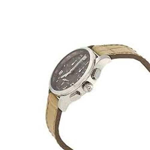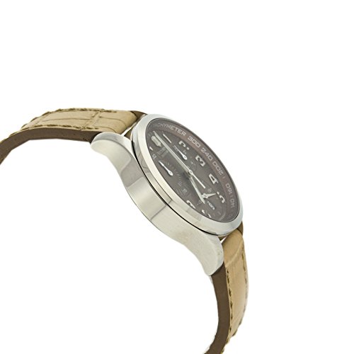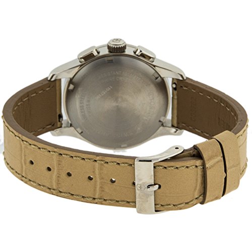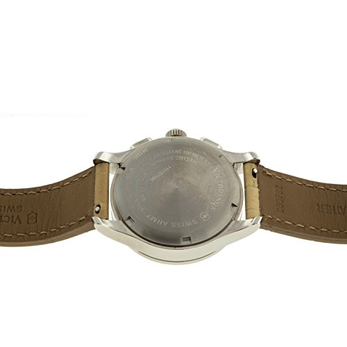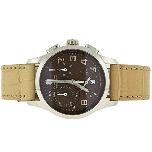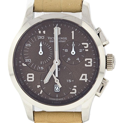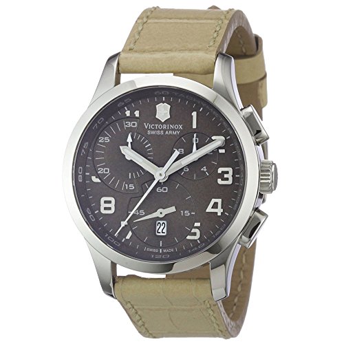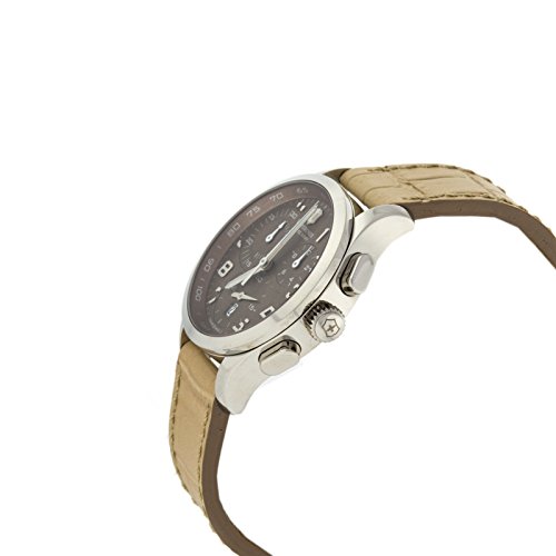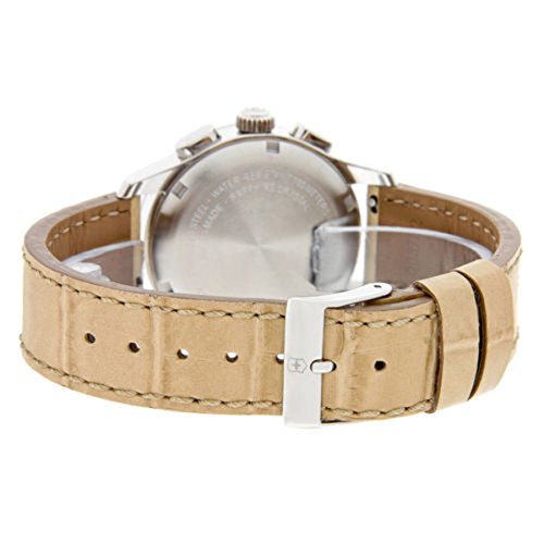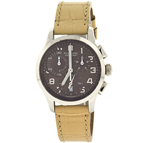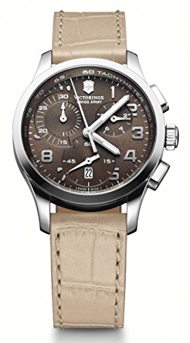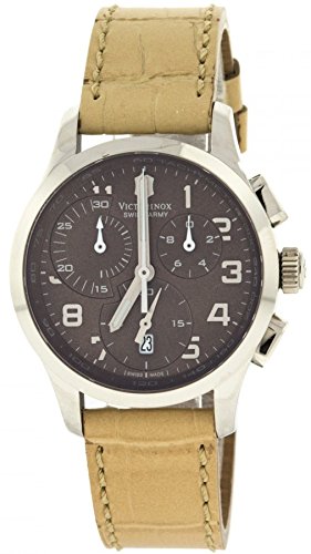 Studio : Victorinox Publisher : Victorinox Binding : Watch Product Description Stainless steel case with a beige leather strap. Fixed stainless steel bezel. Brown dial with silver-tone hands and Arabic numeral hour markers. Minute marker. Tachymeter around the outer rim. Dial Type: Analog. Luminescent hands. Date display at the 6 o'clock position. Chronograph - three sub-dials displaying: 60 second, 30 minute and 1/10th of a second. Quartz movement. Scratch resistant sapphire crystal. Solid case back. Case diameter: 34 mm. Case thickness: 11 mm. Round case shape. Band width: 17 mm. Tang clasp. Water resistant at 100 meters / 330 feet. Functions: chronograph, date, hour, minute, second. Casual watch style. Watch label: Swiss Made. Victorinox Alliance Chronograph Brown Dial Stainless Steel Ladies Watch 241320. 0