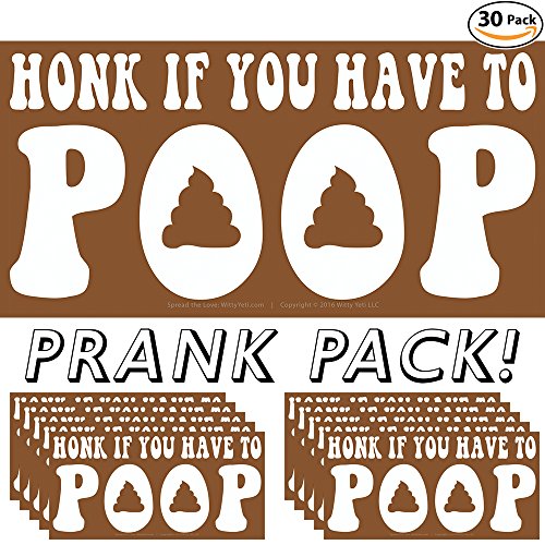 -. Brand : Witty Yeti -. Feature : EVERYBODY POOPS & IT'S HIGH-TIME WE ACKNOWLEDGED IT. There's nothing to be ashamed of. Let's start a rallying cry of honks in support of this natural bodily process. / MESS WITH YOUR FRIENDS. Stick the 3" x 6" bumper sticker on anything where your victim won't expect it. Just imagine your oblivious friend driving around for days with this on his or her bumper! / GREAT GAG GIFT for a secret santa, graduation, fraternity or sorority initiation, white elephant, or just as a surP.R.Ise for a friend or loved one with a refined sense of humor. / AP.R.IL FOOLS ALL YEAR LONG. The world needs more fun and lighthearted pranks. Everyone will get a kick out of this hilarious practical joke pack. / GUARANTEED TO GET LAUGHS OR YOUR MONEY BACK. You and your friends will laugh your asses off when they get home and try to figure out why everyone was honking at them. -. Label : Witty Yeti -. Manufacturer : Witty Yeti -. MPN : Honk If 10 Pack -. PackageQuantity : 1 -. PartNumber : Honk If 10 Pack -. ProductGroup : Automotive Parts and Accessories -. ProductTypeName : AUTO_ACCESSORY -. Publisher : Witty Yeti -. Size : 10 Pack -. Studio : Witty Yeti -. Title : Honk If You Have to Poop Prank Bumper Sticker Parent