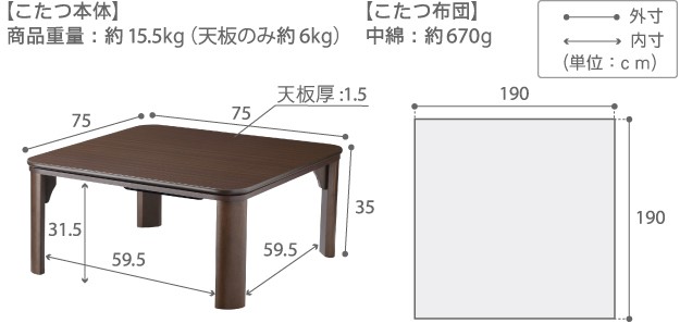 天板サイズ:幅75x奥行75cm・厚み15mm・6kg