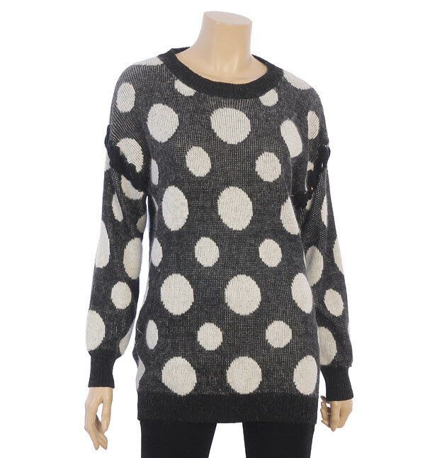 EGOIST, 배색 도트 패턴과 소매 장식이 어우러져 밋밋함을 덜어내고 러블리하고 여성스러운 멋의 니트 티셔츠입니다