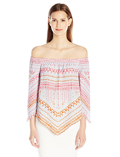 An on-trend off the shoulder top in smooth georgette with folkloric color blocked print. Wide sleeves sleeves and handkerchief hem add to the bohemian flair.