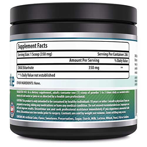 PURE DMAE Our DMAE powder is made from nothing but DMAE bitartrate! With no additives, preservatives or fillers of any kind, it gives you maximum benefits. It is free of sugar, starch, milk, lactose, wheat, yeast, fish or sodium.