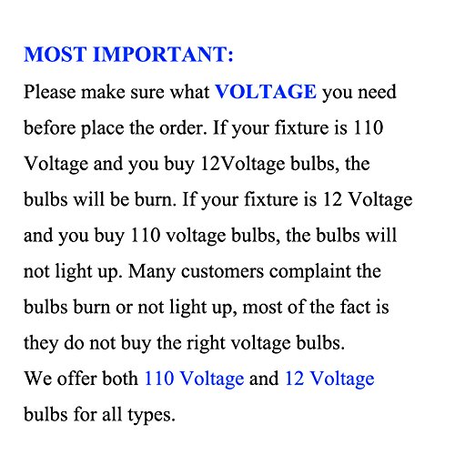 Applications: These products for replacement for conventional MR16 lamp, widely use in shopping mall, hotels, restaurant, cafes, office, museums, home indoor lighting, specialty stores, jewelry store, etc. Please make sure what VOLTAGE you need before place the order. If your fixture is 110 Voltage and you buy 12 Voltage bulbs, the bulbs will be burn.If your fixture is 12 Voltage and you buy 110 voltage bulbs, the bulbs will not light up. Many customers complaint the bulbs burn or not light up, most of the fact is they do not buy the right voltage bulbs. We offer both 110 Voltage and 12 Voltage bulbs for all types.
