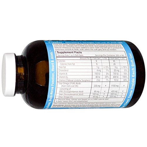 Studio : Carlson Labs Publisher : Carlson Labs Binding : Health and Beauty Product Description From the deep, pristine waters near Norway, Carlson provides the finest cod liver oil, naturally rich in EPA and DHA, and supplying Vitamins A D. Natural Vitamin E has been added to each 1000 mg soft gel to protect the freshness of EPA DHA, both within the soft gels and our bodies. 0