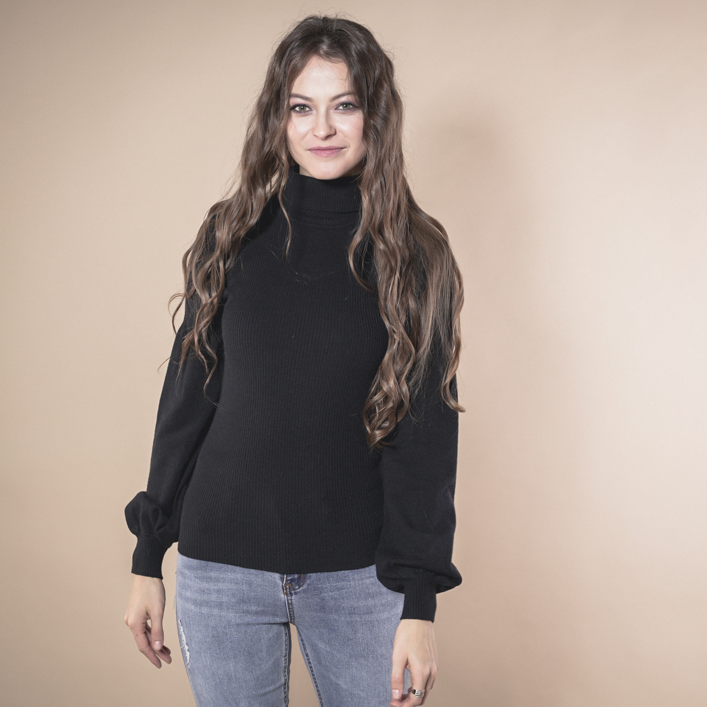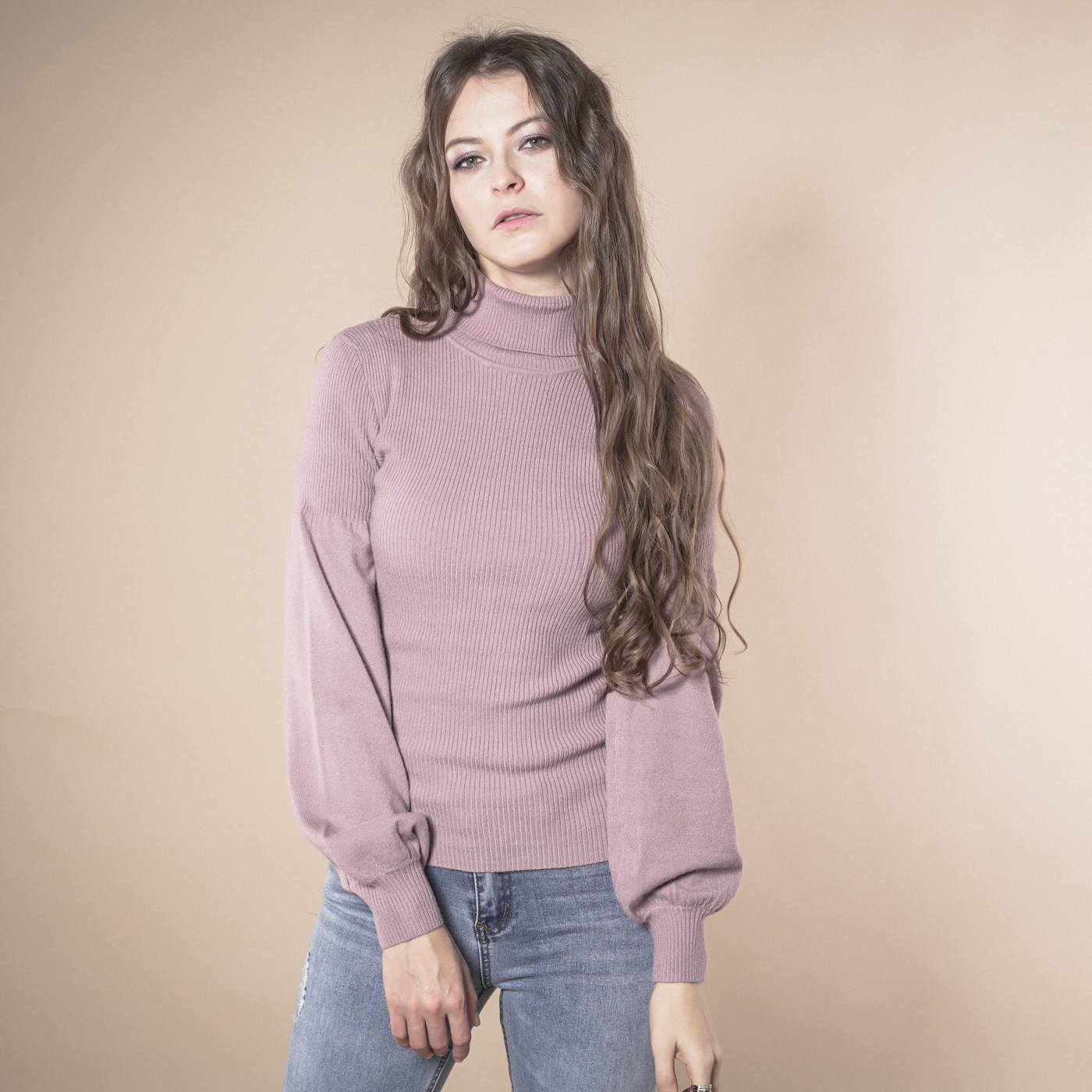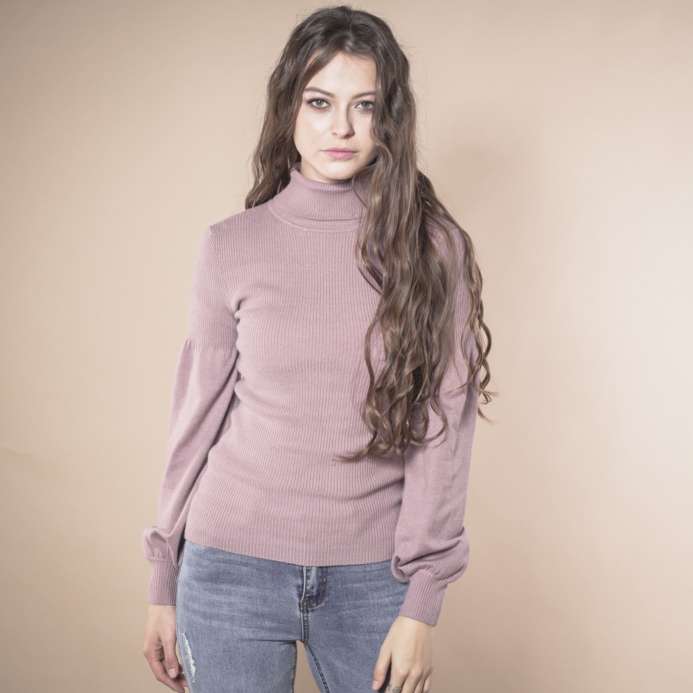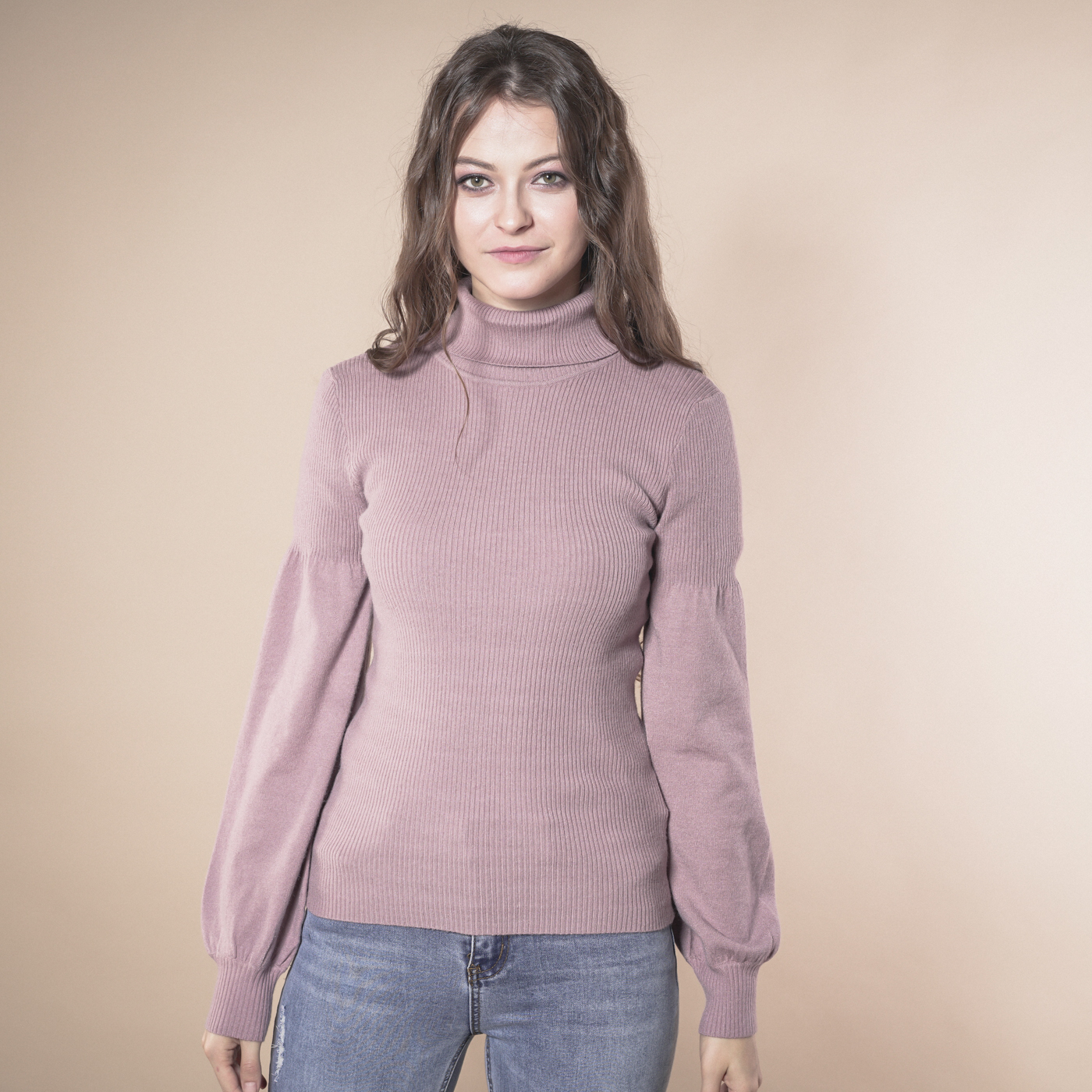 볼륨소매가 우아한 여성스런 하이넥 니트탑입니다.