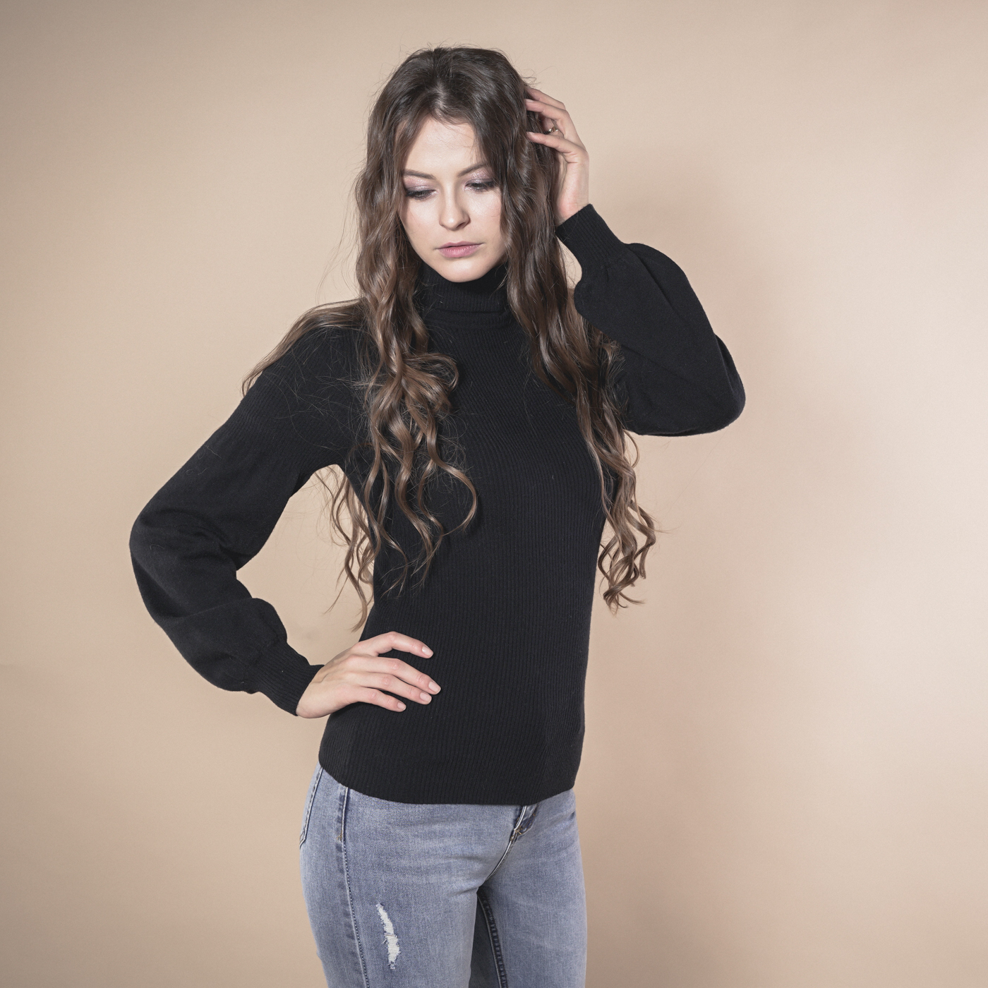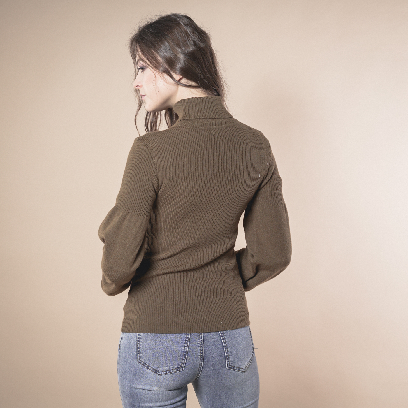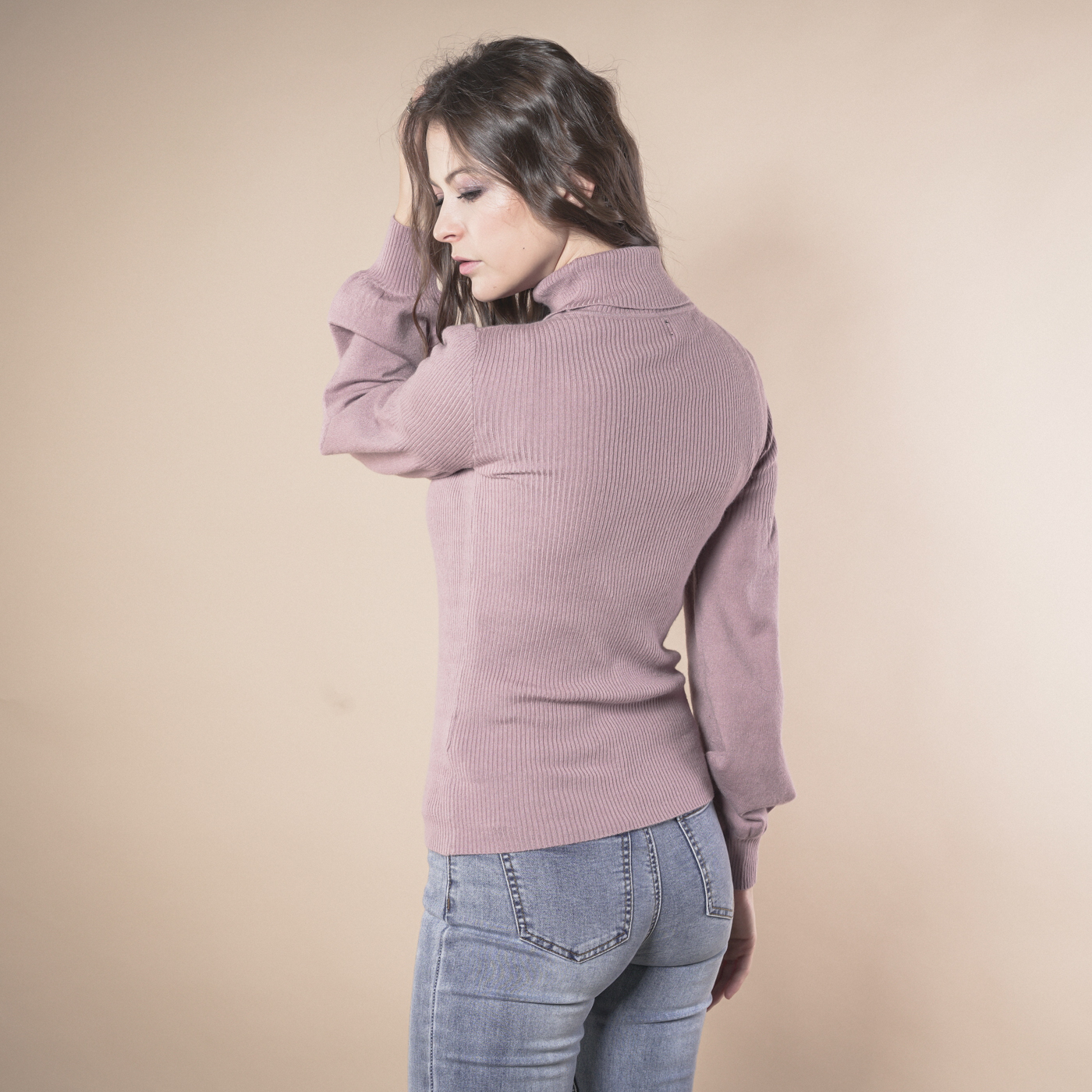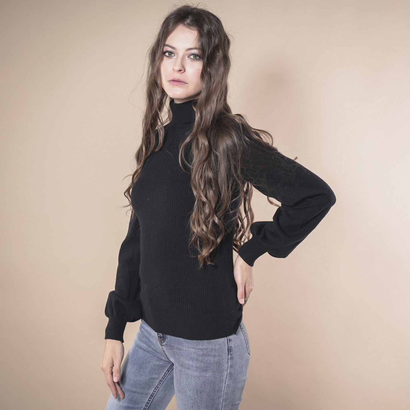 볼륨소매가 우아한 여성스런 하이넥 니트탑입니다.