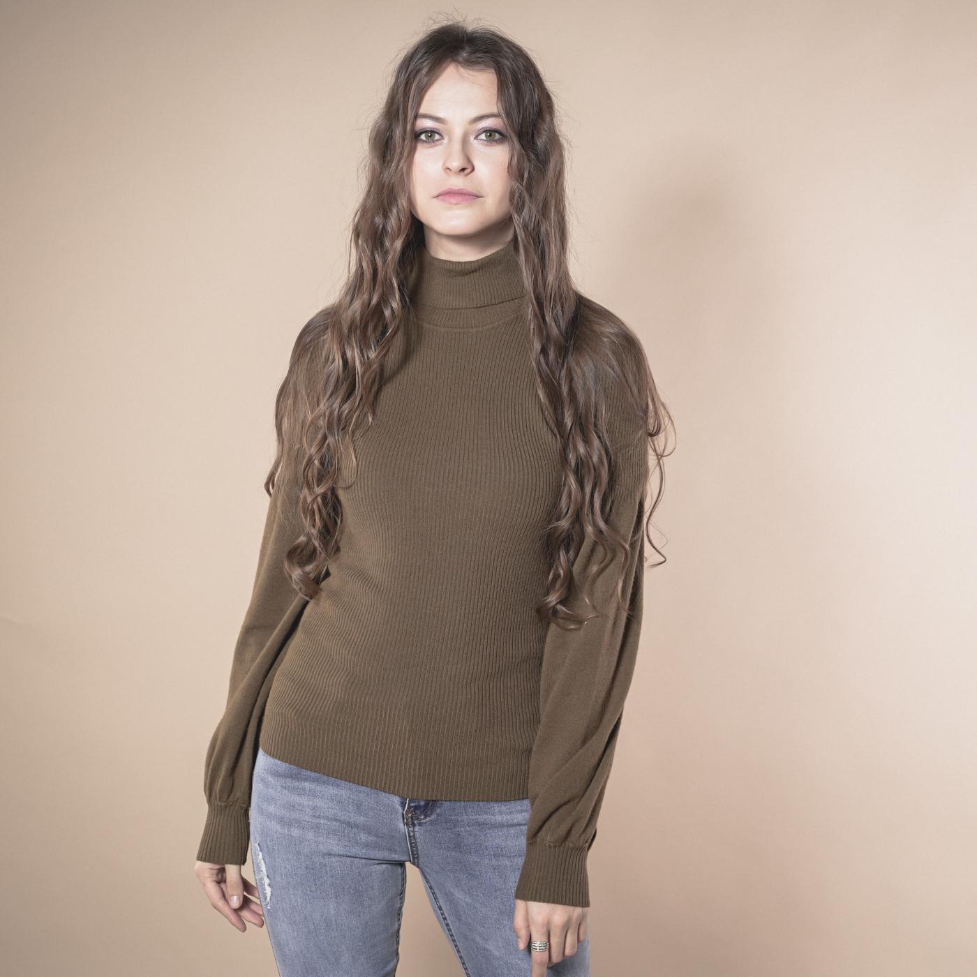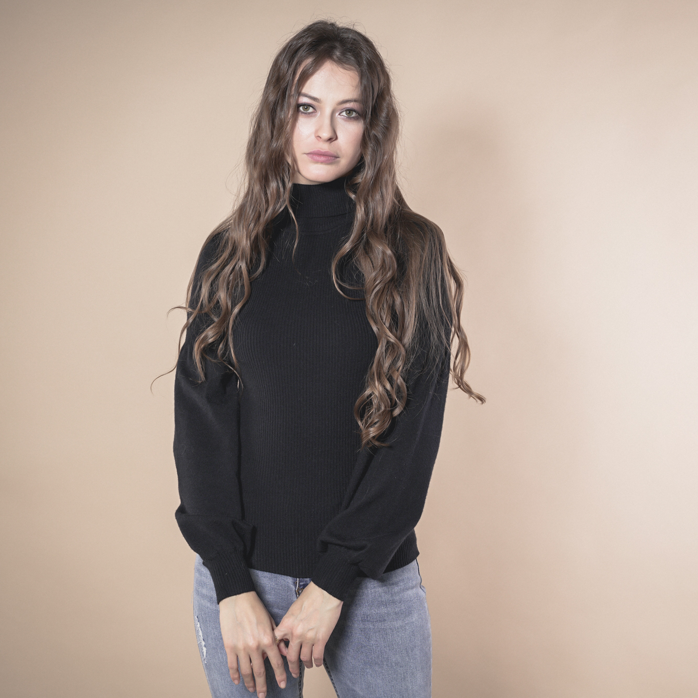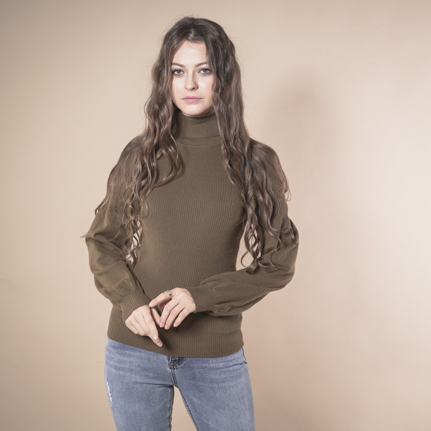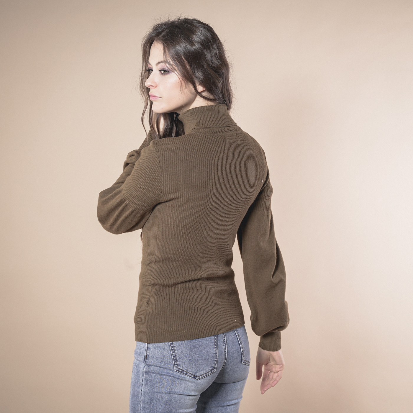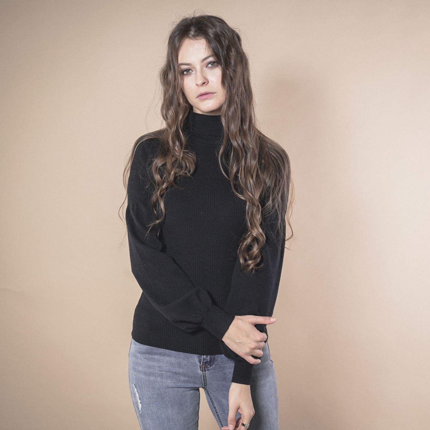 볼륨소매가 우아한 여성스런 하이넥 니트탑입니다.
