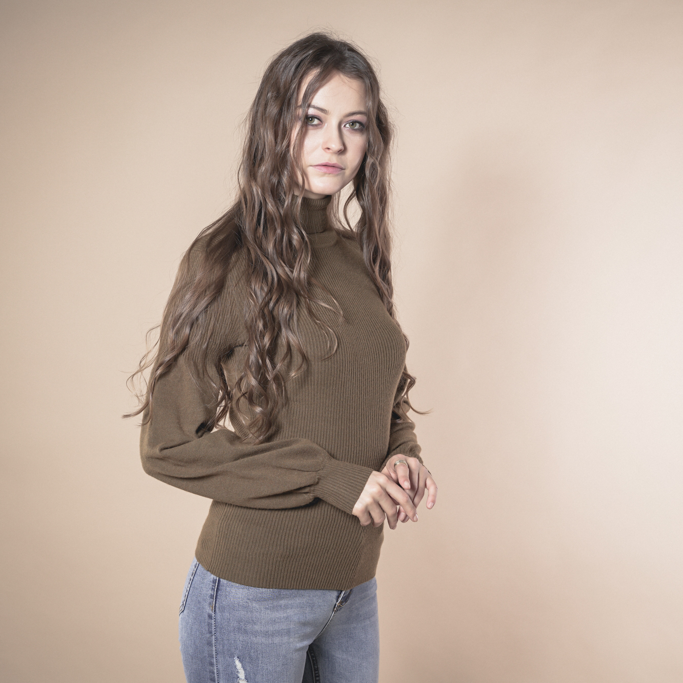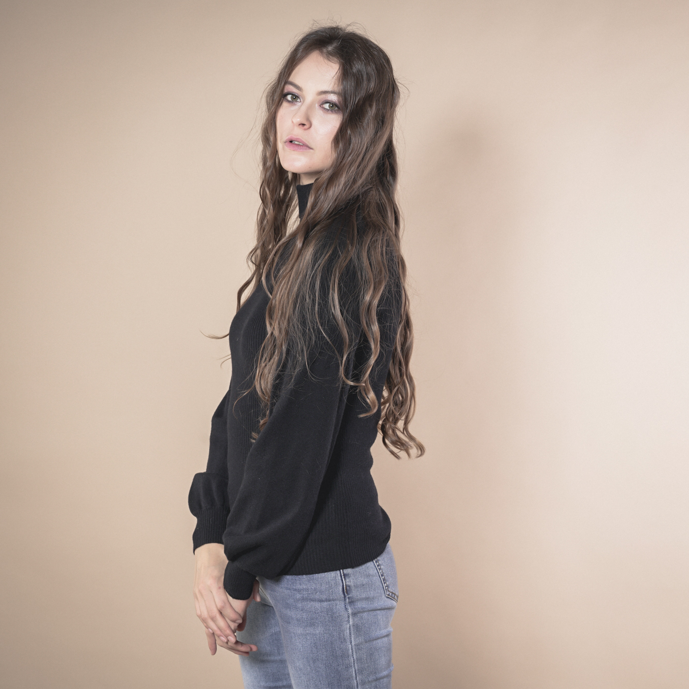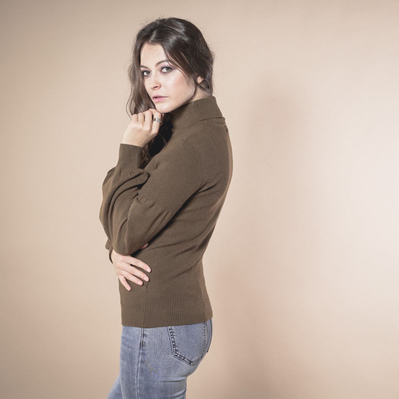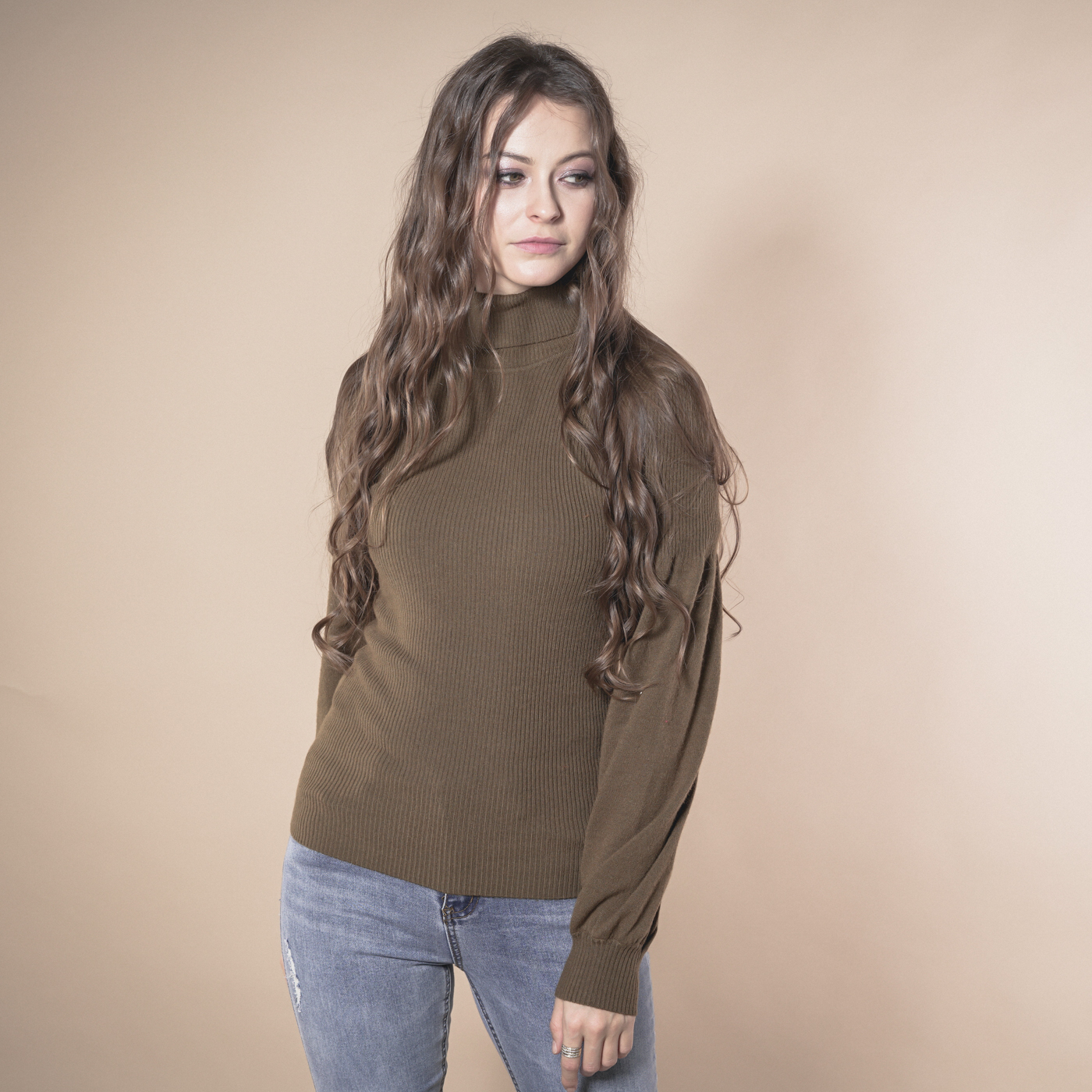 볼륨소매가 우아한 여성스런 하이넥 니트탑입니다.