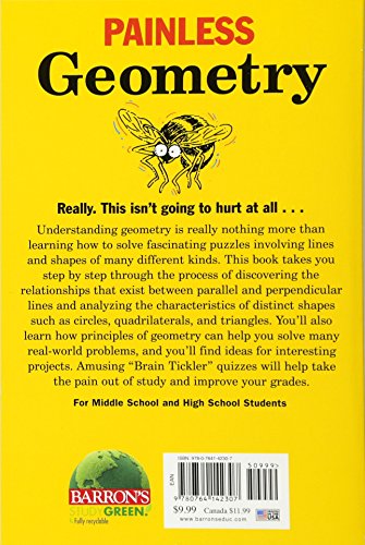 The author demonstrates how solving geometric problems amounts to fitting parts together to solve interesting puzzles. Students discover relationships that exist between parallel and perpendicular lines; analyze the characteristics of distinct shapes such as circles, quadrilaterals, and triangles; and learn how geometric principles can solve real-world problems. Titles in Barron's Painless Series are written especially for middle school and high school students who are having a difficult time with a specific subject. In many cases, a student is confused by the subject's complexity and details. Still other students simply finds a subject uninteresting, an attitude that usually results in lower grades. Painless titles offer informal, student-friendly approaches to each subject, emphasizing interesting details, supplementing the text with amusing insights, and outlining potential pitfalls clearly and step by step. Students begin to understand how disparate details all fit together to form a clear picture. Timelines, ideas for interesting projects, and "Brain Tickler" quizzes in many of these titles help to take the pain out of study and improve each student's grades.