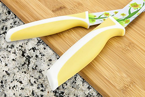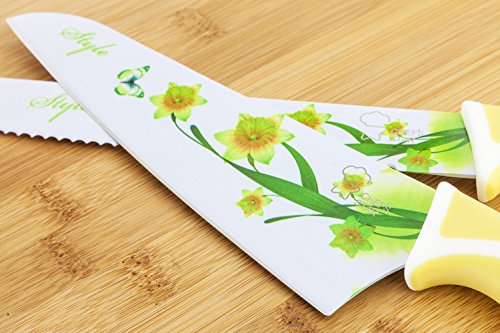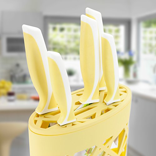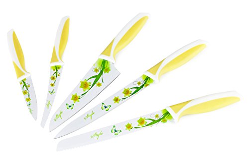- Feature : 6-piece set includes an 8" Bread knife, 8" Slicer knife, 6.5" Santoku knife/ Chef knife, 4.5" Steak knife, 3.5" Paring knife and yellow basket weave Polypropylene knife block, Packed in a Premium Gift Box. Organize and store your cutlery in the included knife block. Great gift idea; Hugely attractive, contemporary and modern knife set in a wonderful colorful blade and handle. They arrive in an elegant box. / Handle is a yellow and white Polypropylene + TPR, its slip resistant making them incredibly comfortable and secure in your hands even when wet, The handles are ergonomically designed so your hands and wrists will no longer take the strain of chopping and cutting as all the pressure goes into the blade ensuring you cut with professional and graceful ease. Enjoy preparing food as much as your family will love savoring every delicious mouthful. / Save time preparing food with Chef's Stars knife set: Incredibly sharp stainless steel edges, made to stay sharp, your first touch will cut easily into anything; Chef's Star knives feature a high grade Stainless Steel blade that reduce the sticking of food to the knife allowing them to glide effortlessly through even the thickest foods. Blade is made of high grade Stainless Steel ( 2CR13 ) with color coating for long lasting sharpness and corrosion prevention. Feel like a top culinary chef as every chop, slice and cut will be the quickest and easiest you've ever known, preparing family meals suddenly got a whole lot quicker. / Save money with lasting quality: Because of the thick Blade and sturdy, Ergonomically designed handles, Force applied via the handle goes into the blade because the knives are perfectly balanced for precision while cutting. Perfect Geometry, High forging precision, higher stability of the blade, Less metal fatigue - Improved steel structure, Lasting Razor Sharp Edge. Therefore these knives last much, much longer than even the best knife set in its price range. The sturdy blade's white with yellow and green flowered coating for non-stick makes cleaning up a breeze, just wipe with a soapy cloth. All knives are dishwasher safe and store safely in the knife block. / ENJOY COOKING AGAIN: now it's so much easier and quicker to prepare food with Chef's Star Knife Set. preparing meals is comfortable and easy as all the pressure goes from the fingers and thumbs into the blade where it's needed. Enjoy cutting, Slicing and dicing all kinds of food like meat, roast, beef, chicken etc. slicing bread, filleting, deboning or boning fish, peeling fruits and vegetables, slicing a single garlic clove or shallot, controlled, detailed cutting, such as cutting shapes or vents into dough.