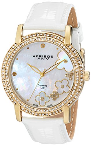 -. Feature : Mother-of-pearl dial with an array of flowers and genuine diamonds / Crystal filled bezel / White leather strap with gold tone buckle / Swiss quartz movement / Water resistant to 99 feet (30 M): withstands rain and splashes of water, but not showering or submersion