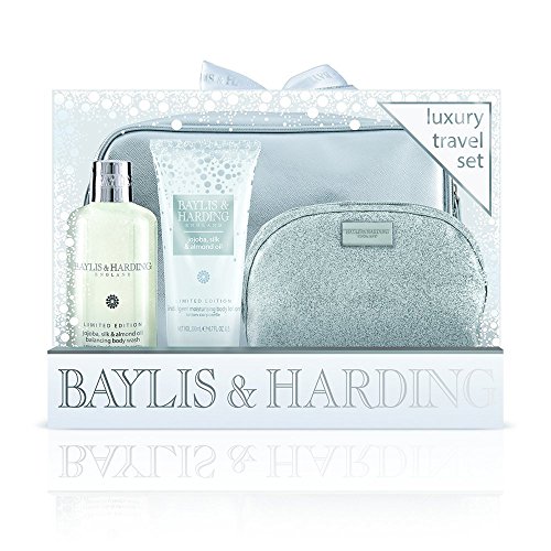 For anyone going abroad for a longer vacation, Baylis & Harding's Jojoba, Silk & Almond Oil Luxury Travel Set provides full size bottles of two of our most popular products - Balancing Body Wash (300ml) and Moisturizing Body Lotion (200ml). The set also includes two stylish sparkly metallic-colored cosmetics bags which will be useful for packing makeup and other beauty products. The two products work in complete harmony, with the Body Wash cleansing and revitalizing while the Body Lotion drenches your skin with expertly formulated blends to lock in moisture for long-lasting, silky smooth results. Richly fragranced with a warm and intensely comforting infusion of soothing Almond Oil and Jojoba, this dynamic duo is an essential travel companion to anyone going away for any length of time. The festive gift set is delivered in a stylish silver box covered in sparkle and shimmer, all finished off with Baylis & Harding's signature gift ribbon.Feature
