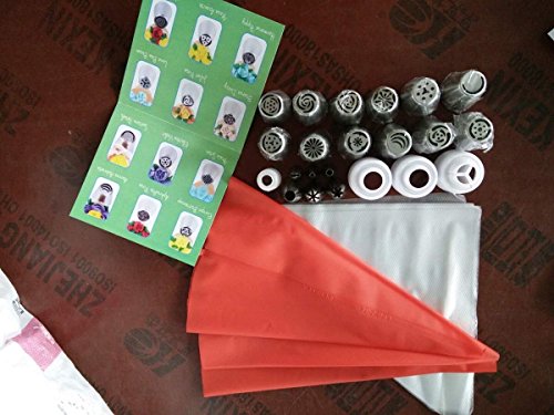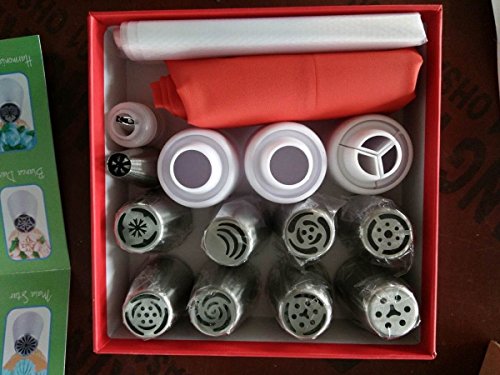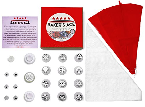 Studio : Aurora Products LLC Publisher : Aurora Products LLC Product Description Note: WE listened! We have changed packaging color and piping bags to red at your suggestion and are in transition now. However, there may still be a few plain brown left that you may receive at this time. Both are the same except for the color. Are you ready to shock and awe with your cake and cupcake decorating skills? With the Baker's Ace Russian Piping Tips Set, nobody will ever know how easy it was to create baking masterpieces. We've made things simple with a perfect balance of icing nozzles, piping bags, couplers, and a buttercream recipe that saves time and makes it easy for any experience level. We're so confident, a first time user did the decorations for our ads, tip chart, and images. We considered YOUR needs based on our own experiences. Don't buy a cheaper set only to discover you need more couplers and reusable piping bags. Don't waste time searching for a buttercream recipe. We've thought of these things for you and put it in a 6 x 6 x 2 inch gift box that's easily stored in your kitchen. We hand-selected 12 Russian Piping Tips and 6 Standard Tips for the perfect sized set. Use vibrant colors with your favorite rose tip or be creative with a petal tip to make decorating an artistic breeze. The Open Star, Closed Star, and Round Tips are perfect for borders, decorative designs, or writing a special greeting. The 2 most common leaf tips are also included to help make eye-popping treats for a wedding, baby shower, birthday, or holiday. Colors like red, yellow, white, and green get used often when decorating. Using multiple bags for only 2 tips and a single color is wasteful and frustrating. Just swap out a rose tip with a tulip tip using one of the many couplers and away you go. The 3 reusable silicon bags are dishwasher safe and have a rough outer surface for improved grip. They have the perfect thickness to easily work ALL the frosting into the tip where it's needed. 0