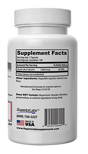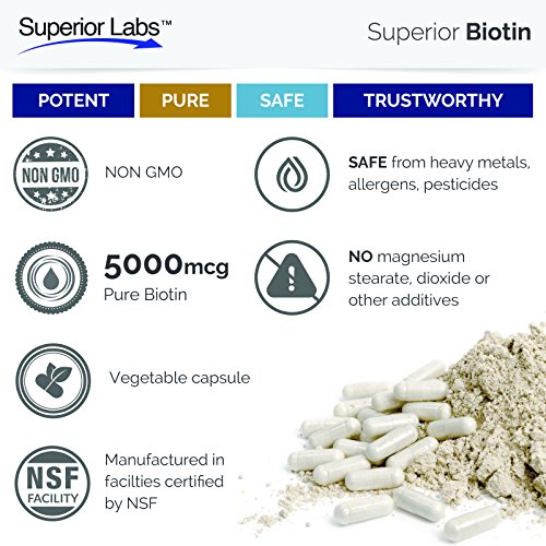 Biotin is a water-soluble B vitamin that is also known as vitamin H and coenzyme R. The Biotin capsules manufactured by Superior Labs contain 5000 mcg pure Biotin, which promotes fuller growth in your lashes, nails, and hair. It can also slow hair loss.* Biotin also strengthens the nails, making them more durable and reducing breakage.* Our natural biotin also helps prevent fungal infection, acne, rashes, severe dryness, and cracking. Additionally, it helps to protect against water loss and damage from sun rays, which leads to healthier, glowing skin.*