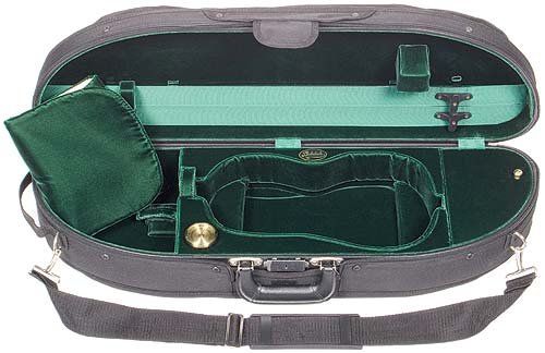 -. Feature : Black exterior with green velvet interior with suspension / A beautifully designed and economical case / Hygrometer, humistat, two bow holders, velcro neck restraint, blanket and accessory pocket / Screw attached canvas cover with music pocket, D-rings, subway strap and shoulder strap / 4/4 violin size