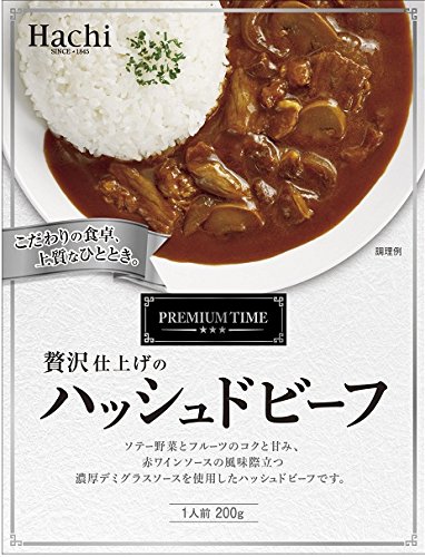 1845年に創業の日本で初めてカレー粉を国産化したハチ食品が作ったレトルトカレーです。プレミアムタイムシリーズは食材と製法にこだわった商品になります。ソテー野菜とフルーツのコクと甘み、赤ワインソースの風味際立つ濃厚デミグラスソースを使用したハッシュドビーフです。